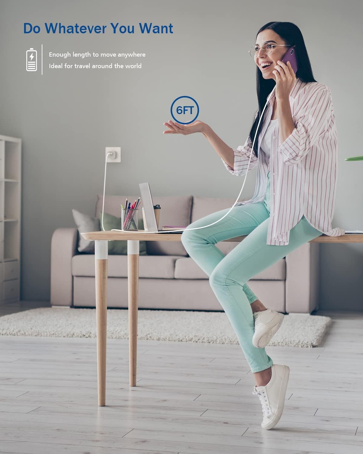 iPhone Certified 6FT Extra Long Fast Charging Data Sync Cable with USB Wall Charger.