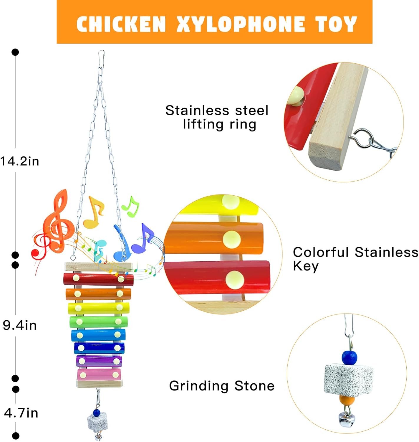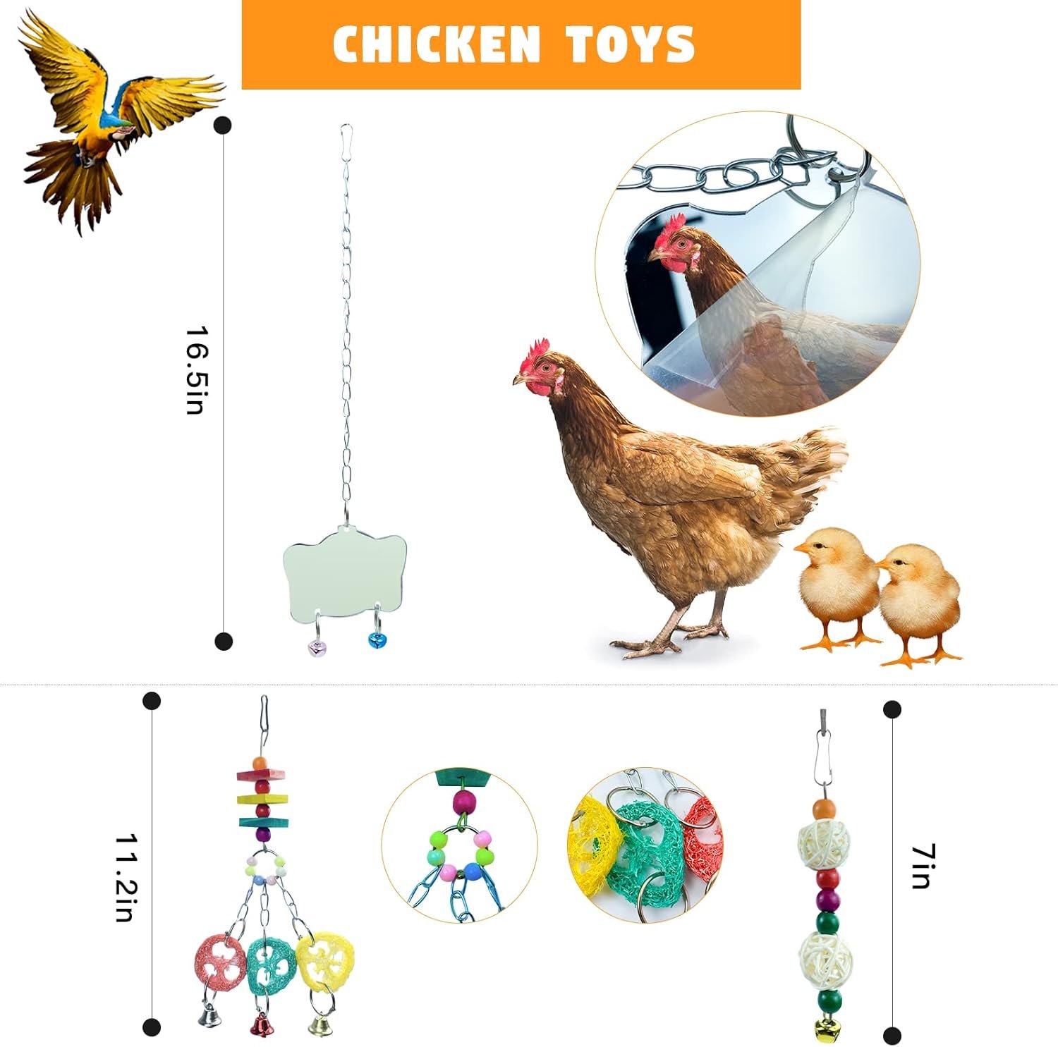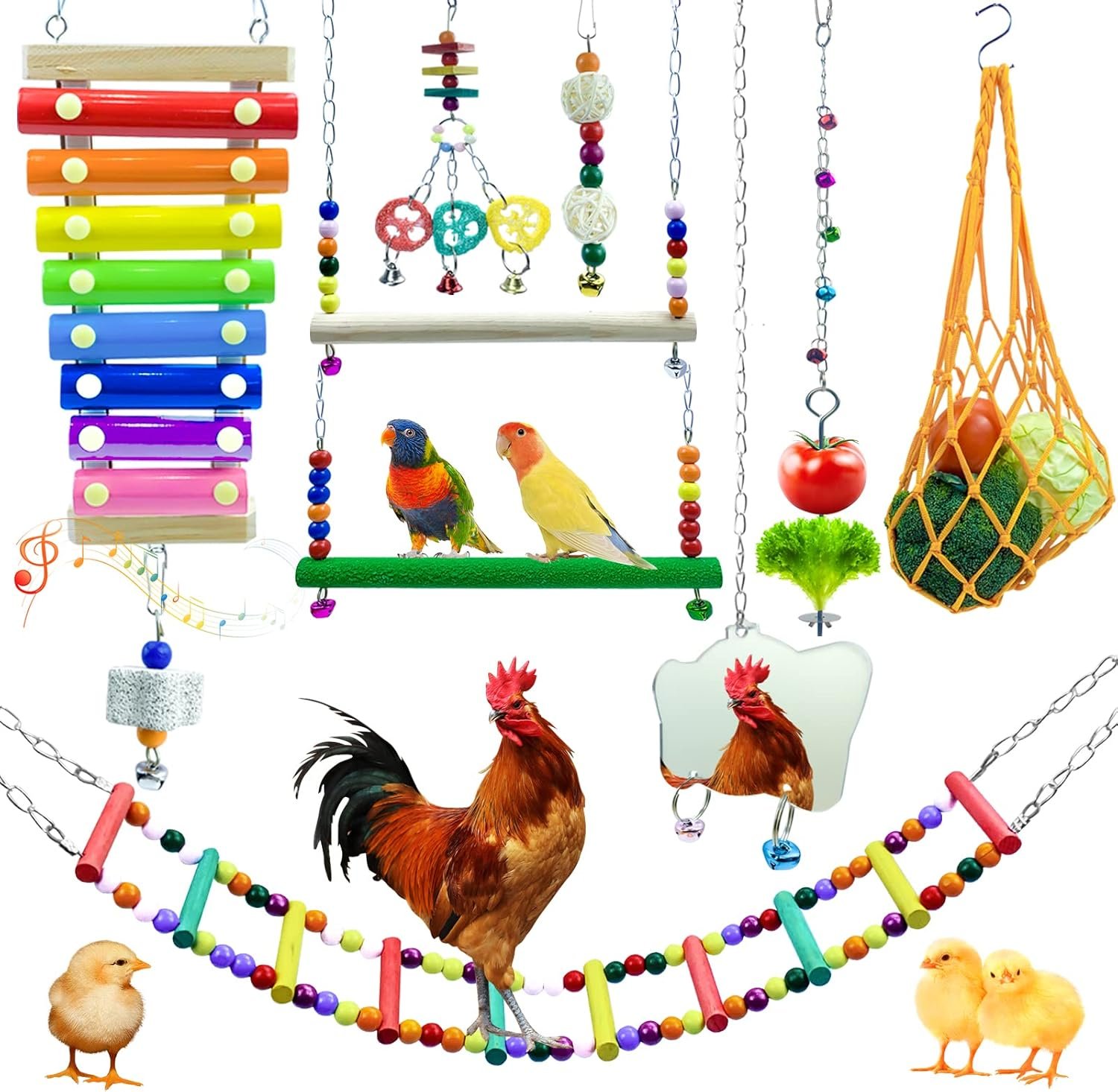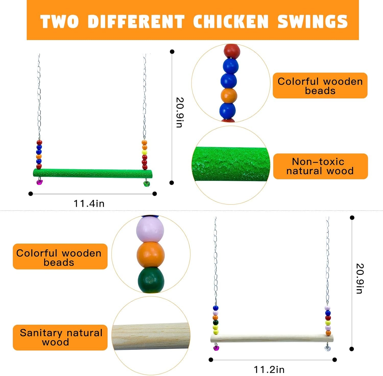 🐔【Package Include】 Chicken coop accessories include: 1 * Chicken Xylophone;2 * different Chicken Swing;1 * Vegetable Fruit Skewers Hanging Feeder;1 * Chicken Flexible Ladder Bridge;1 * Chicken String Bag;1 * Chicken Mirror;3 * Chicken Pecking Toys.
