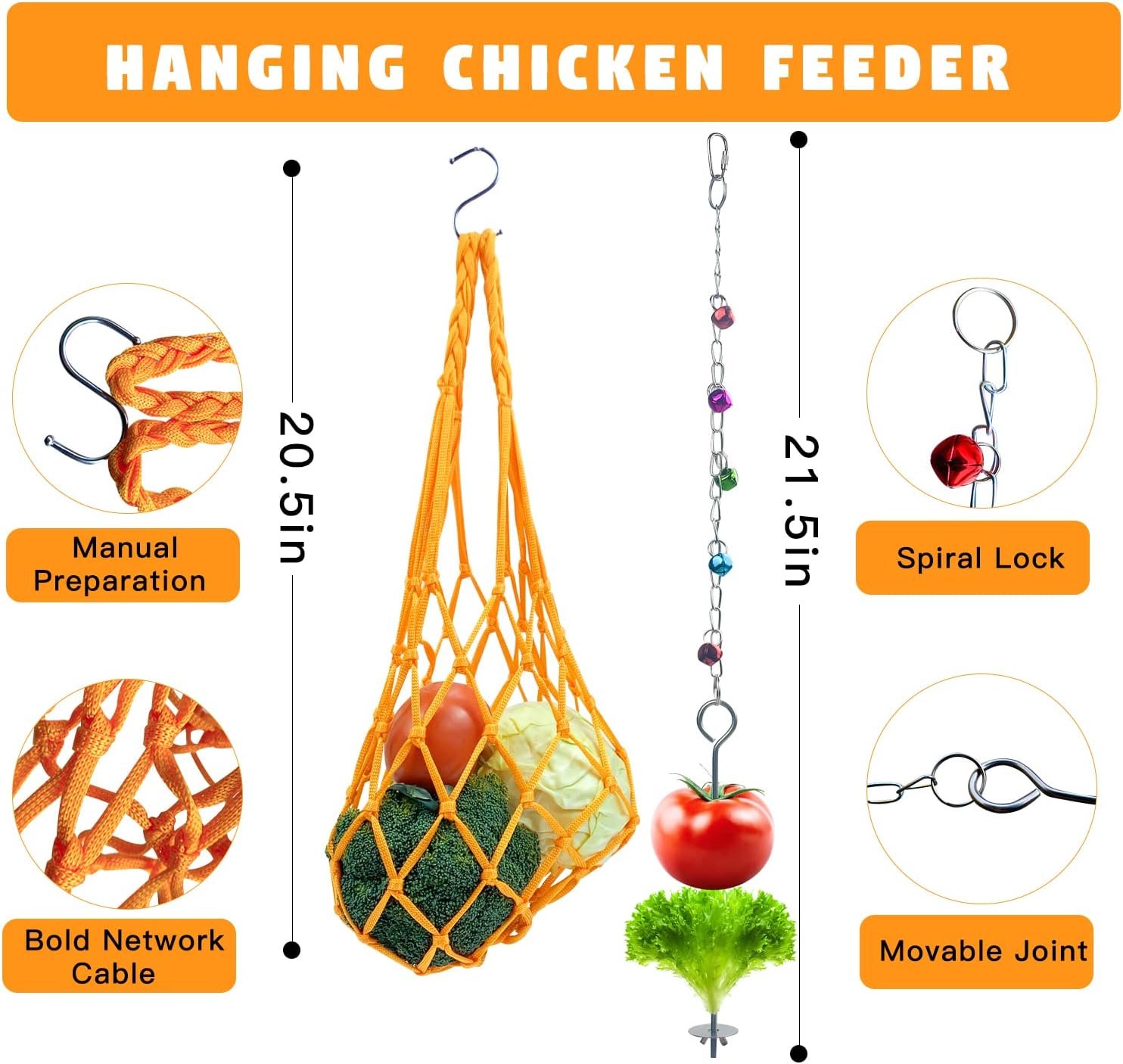 🐔【Functional Veggies Feeder & Pecking 】 Stainless steel feeder and string bag can hang vegetables, stop chickens stop on the food, keep the vegetables and fruits clean and fresh,let your pets enjoy natural flavors,Different Peck That Improves Digestion and Fights Boredom.