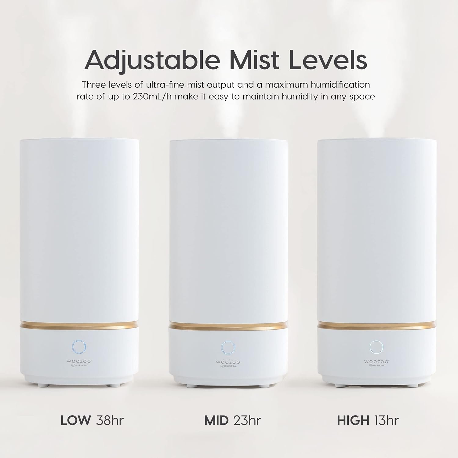 With three (3) levels of ultra-fine mist output and a maximum humidification rate of up to 230mL/h, the WOOZOO Ultrasonic Cool Mist Humidifier makes it easy to maintain humidity at an ideal 30% – 50% in your bedroom, living room, office, or any space. Low humidity can cause problems such as dry skin, sinus discomfort, and can increase static electricity build-up. Better air quality makes for better sleep, helps alleviate dry skin, and even helps to keep plants healthy. The large 3. 0-liter capacity tank enables continuous operation without the need to refill. On a full tank, the Ultrasonic Humidifier runs for up to 38 hours on Low, 23 hours on Medium, or 13 hours on High. The unit shuts off automatically when water runs out. Refill and cleanup are a breeze with the top-fill tank design; simply remove the lid on top to directly access the water reservoir. On the Low setting, the Cool Mist Humidifier’s noise output is less than 37db, even quieter than a library! The nonintrusive blue LED ring creates a relaxing atmosphere perfect for sleep, studying, or even working at home or in the office without disturbance. This is the perfect humidifier for babies’ nurseries, children’s rooms, family rooms, living rooms, offices, studies, bedrooms, and anywhere you can think of. Inspired by the Japanese word for vortex, “uzu”, the IRIS USA WOOZOO series focuses on adjusting and improving air quality with every device. The powerful and convenient WOOZOO Ultrasonic Humidifier offers all the comfort and ease-of-use you need with a straightforward single-button control system. Operation is quick and easy, just push the button and let it work for you.