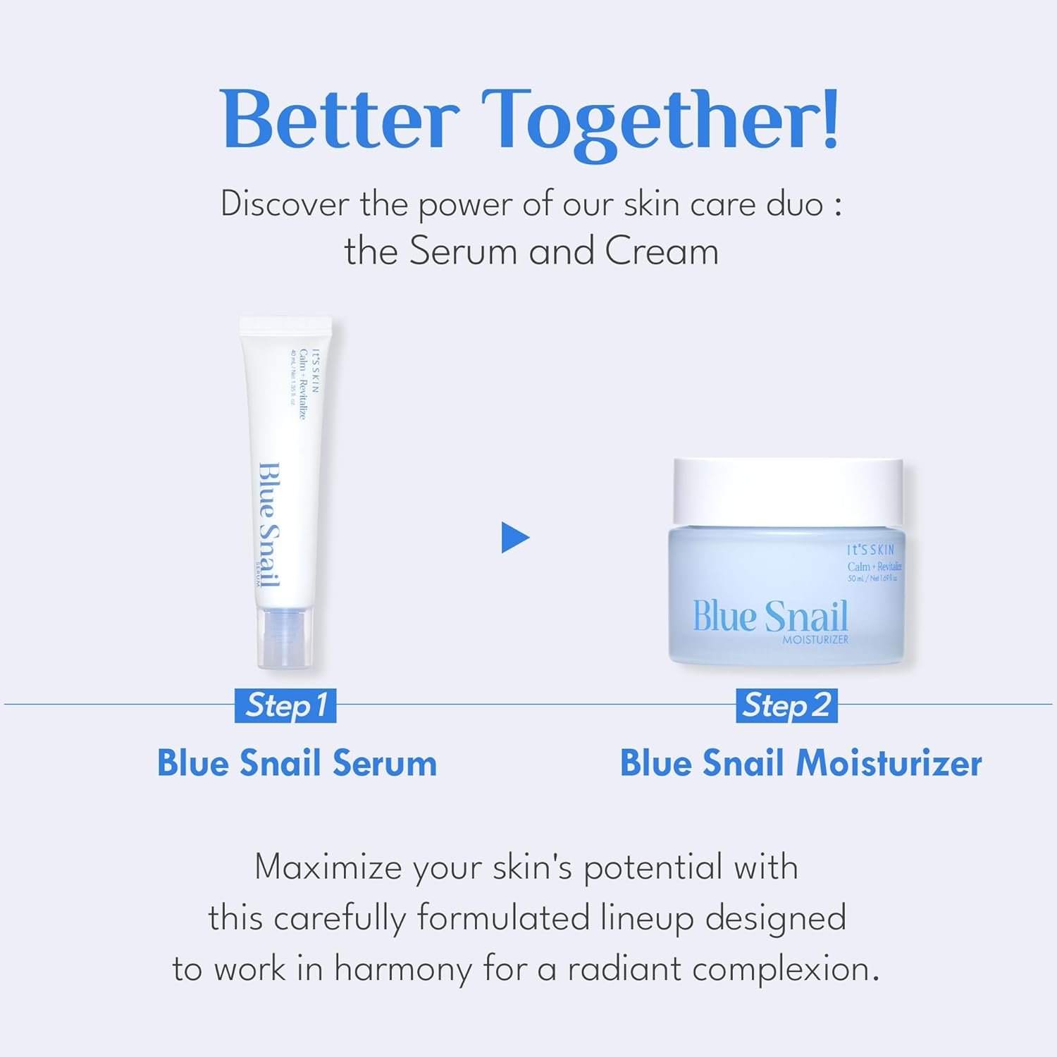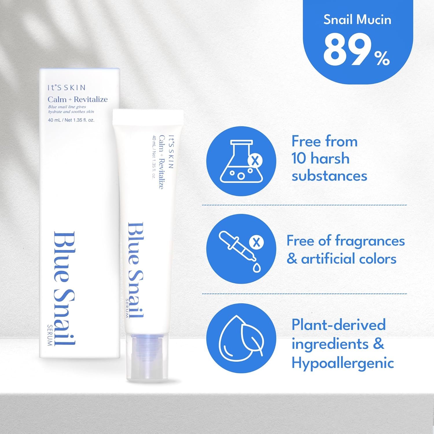 POTENT INGREDIENTS. Discover the secret to radiant skin with IT’S SKIN Blue Snail facial serum. Packed with nature-derived ingredients like Guaiazulene, high-concentration Snail Secretion Filtrate, and Niacinamide, this formula provides deep hydration and renewing properties.