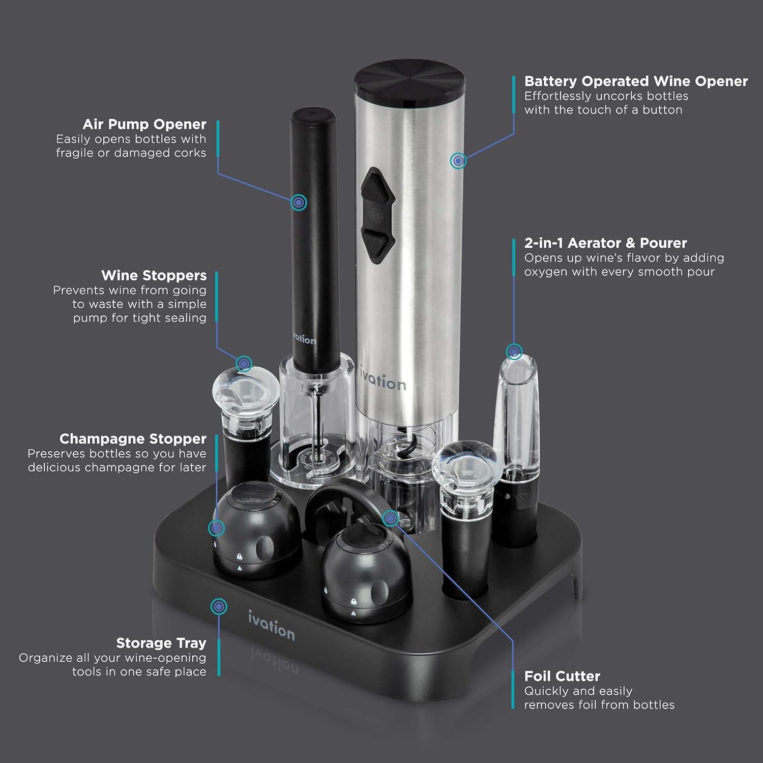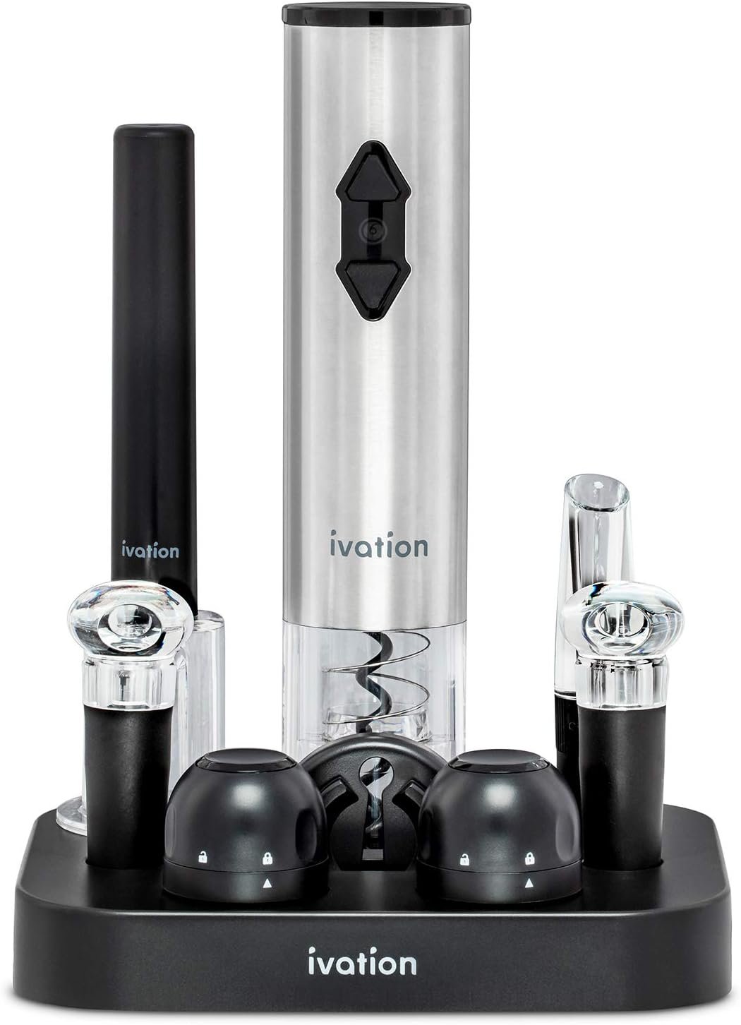 Ivation 9-Piece Wine Opener Gift Set | Deluxe Bar Kit with Electric Battery-Operated Bottle Opener, Air Pump Cork Extractor, Aerator Pourer, Wine Stoppers, Champagne Stoppers, Foil Cutter & Stand