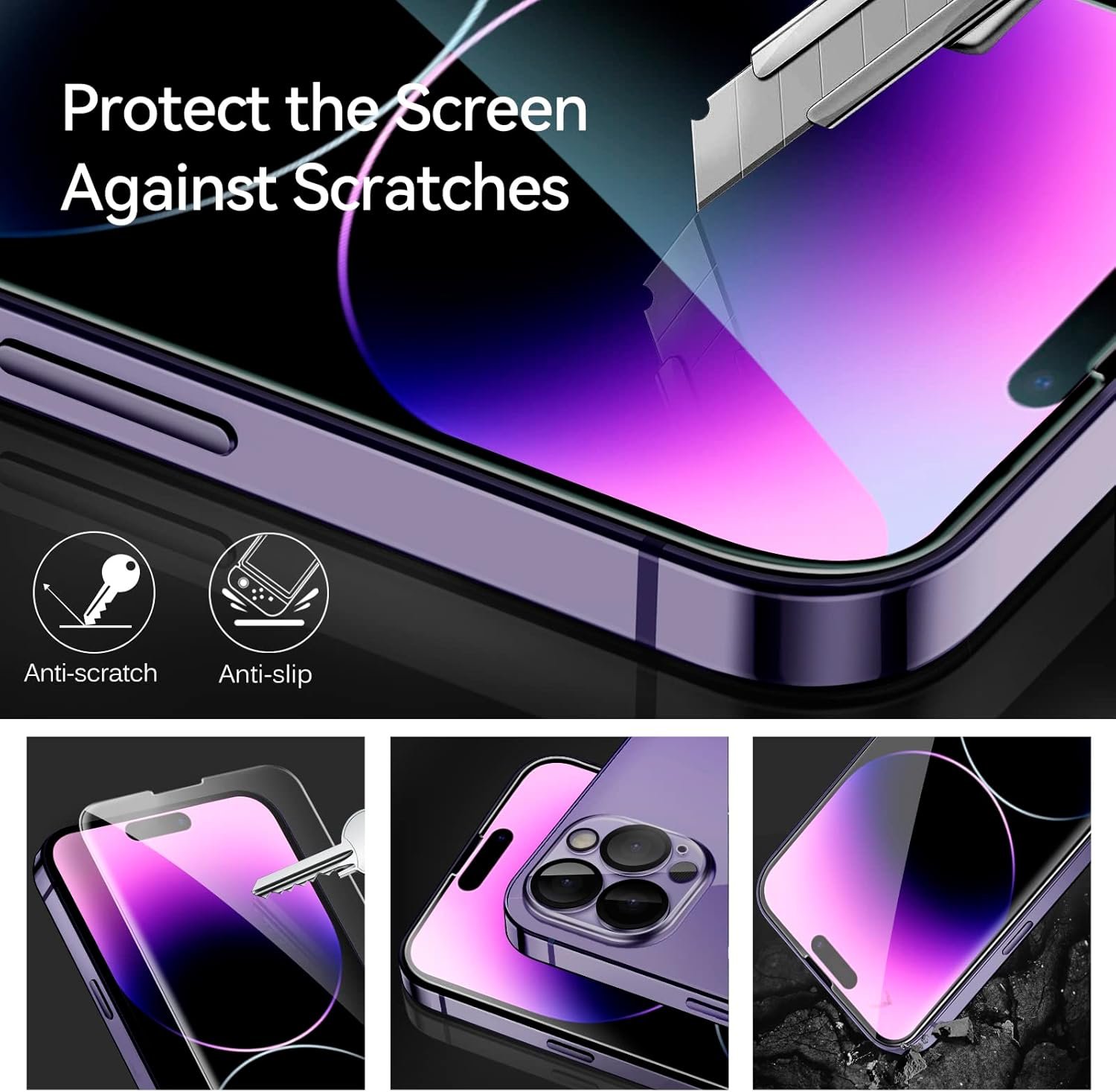 【BUBBLE-FREE & ANTI-FINGERPRINT】 The iPhone 14 Pro tempered glass screen protector will self-expel air bubbles when automatically bonding with the screen. Coated with hydrophobic and oleophobic clear layers on the glass protector can against oil residue from fingerprints from long-term use.