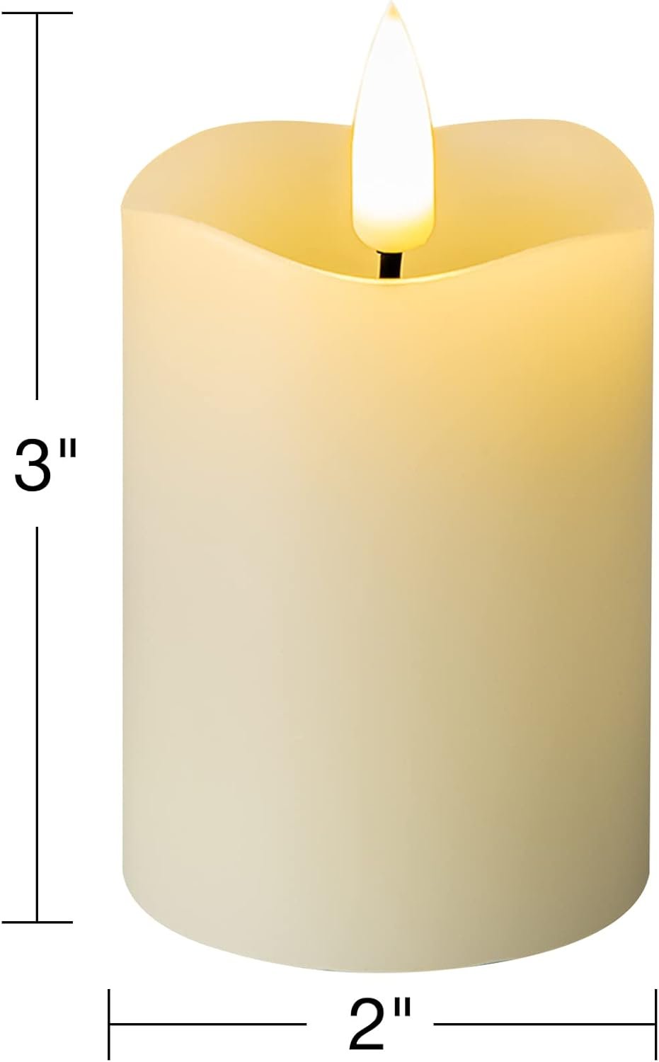 What’s Box – packages includes 6 pack ivory timer candles, all candles are same size, 2 inch diameter 3 inch tall, BATTERIES INCLUDED, user manual.
