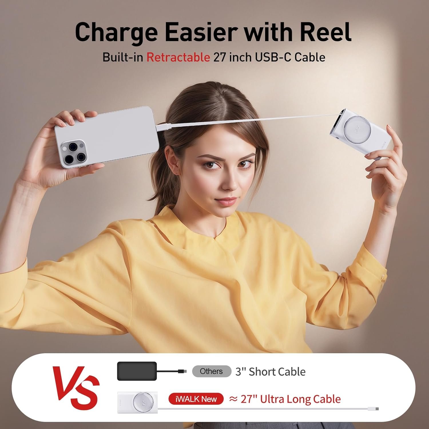 2.3ft Retractable USB-C Cable: iWALK LinkPod Reel power bank is equipped with a built-in retractable cable. Adjustable cable length, charge easier with Reel. Say goodbye to tangled cables and a messy charging environments.