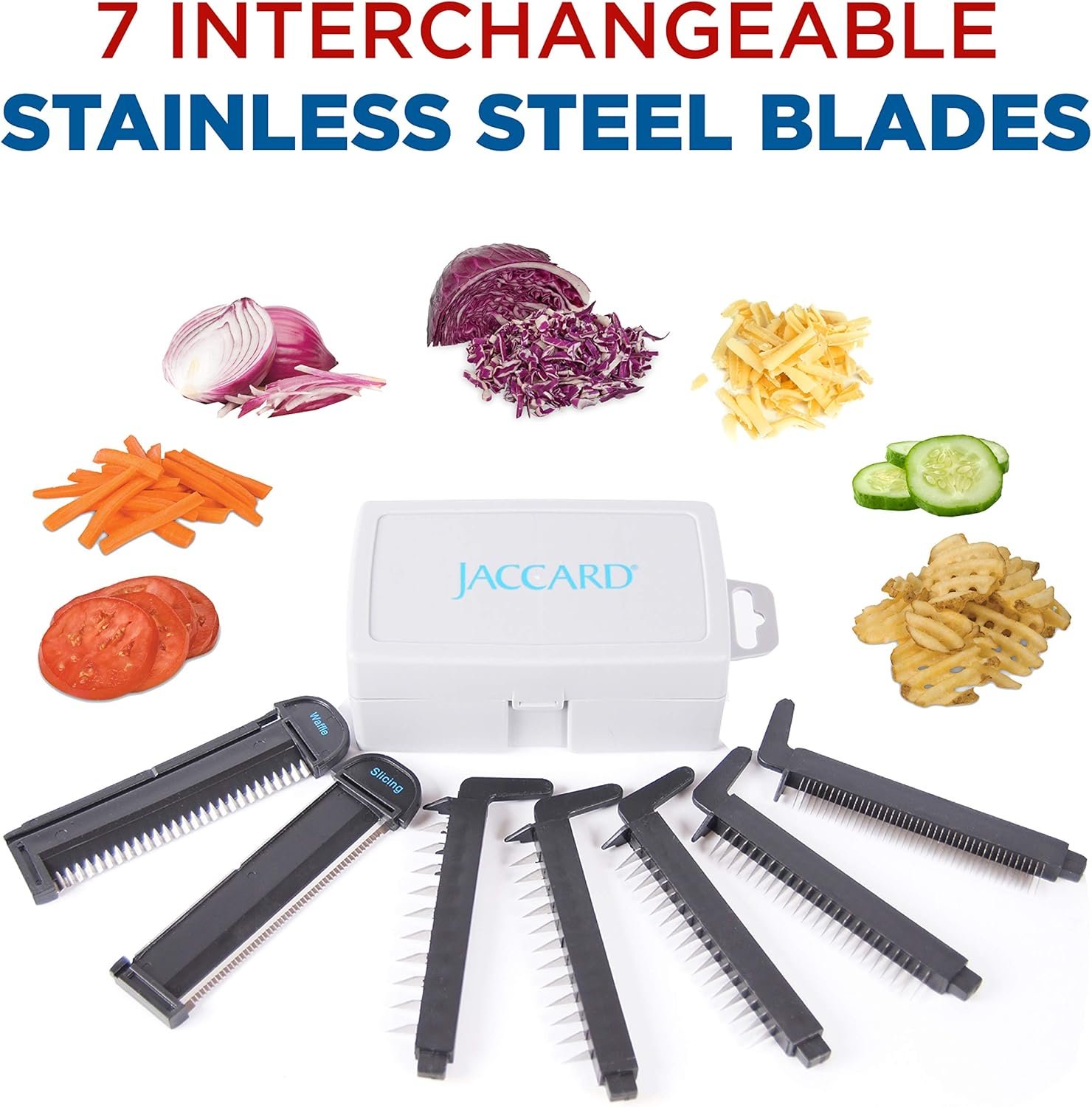 Simplify your kitchen prep and embrace a new level of cooking excellence with the Jaccard Stainless Steel SafeHands Mandolin Slicer. Our mandolin slicer features a patented SafeHands food holder that protects the user’s hands and fingers and keeps them away from razor-sharp slicing blades. From thin straight slices to crinkle cuts and various julienne thicknesses, this vegetable chopper offers maximum flexibility and creativity when preparing food. It includes 7 different stainless steel blades, 1 straight slicing blade, 1 wedge-cut blade, and five Julianne blades, measuring 2mm, 4mm, 6mm, 8mm, and 10mm. Also, the stainless steel frame has a thickness adjustment for precise slicing. Our chopper is designed with slip-resistant legs that effortlessly fold flat, allowing for convenient and compact storage. With our vegetable chopper, you can enjoy professional-level results in the comfort of your kitchen as its razor-sharp blades effortlessly glide through “tough-skinned” produce such as tomatoes, potatoes, and various vegetables. The food chopper features high-quality steel frame and is dishwasher-safe for easy cleaning. Experience safety, convenience, and exceptional performance with our top-of-the-line mandolin slicer. “SafeHands Mandolin” is a registered trademark of Jaccard Corporation.