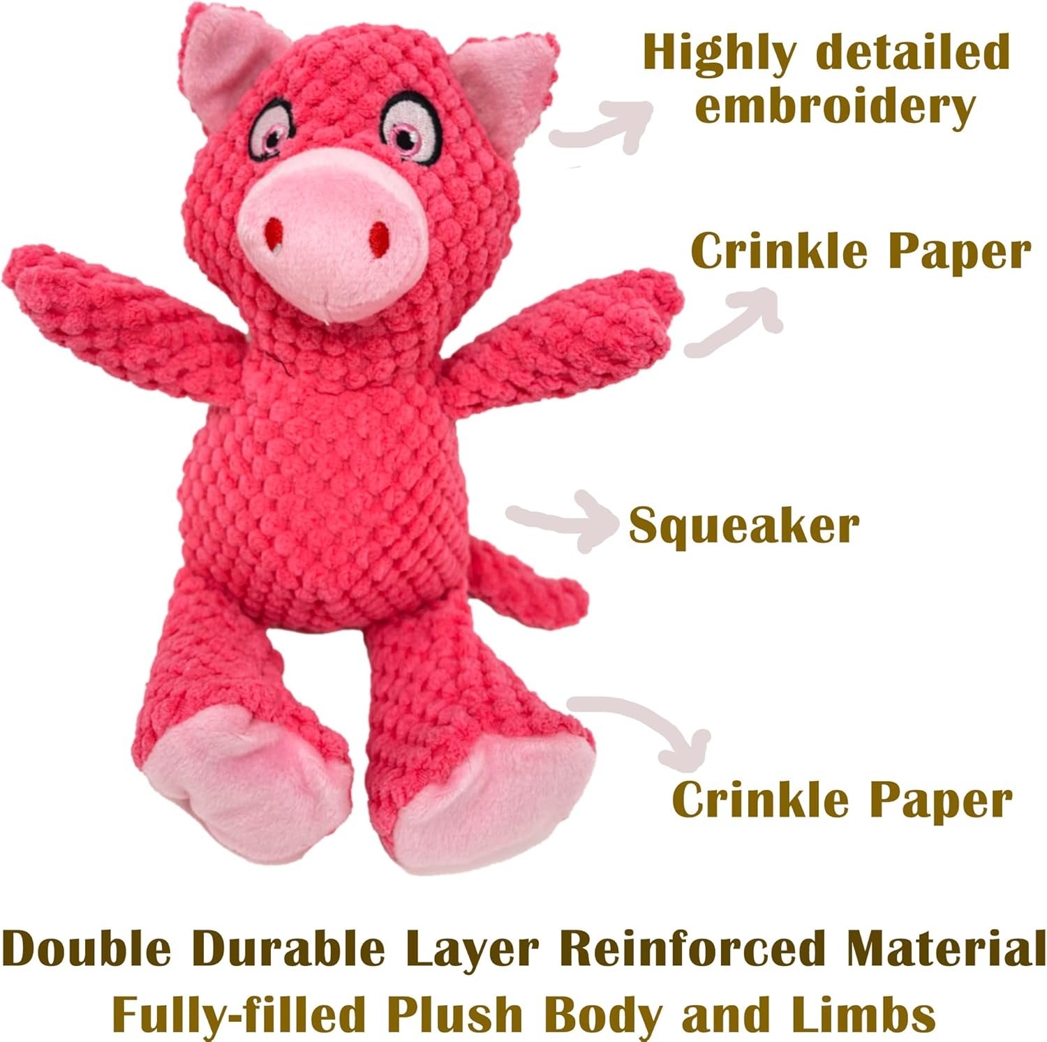 SUPER VALUE &GREAT FUN: Includes 5 Popular Dog Squeaky Toys for Small, Medium and Large Breeds. Five squeaky toys: Monkey, Hippo, Pig, Giraffe, and Raccoon. Soft Plush Creates Chewing Satisfactions For Their Natural Instinct. Stuffing filled body and limbs. Crinkle paper inside arms and legs. Also make squeaky sound. A durable liner is added to the toy for longer play time and durability. We also reinforce all seams to make the toys tougher. Provide hours of fun. Not for aggressive chewers. Like every other toy, the squeaky toys are not indestructible. We recommend supervised play, and timely replacement of the broken ones.