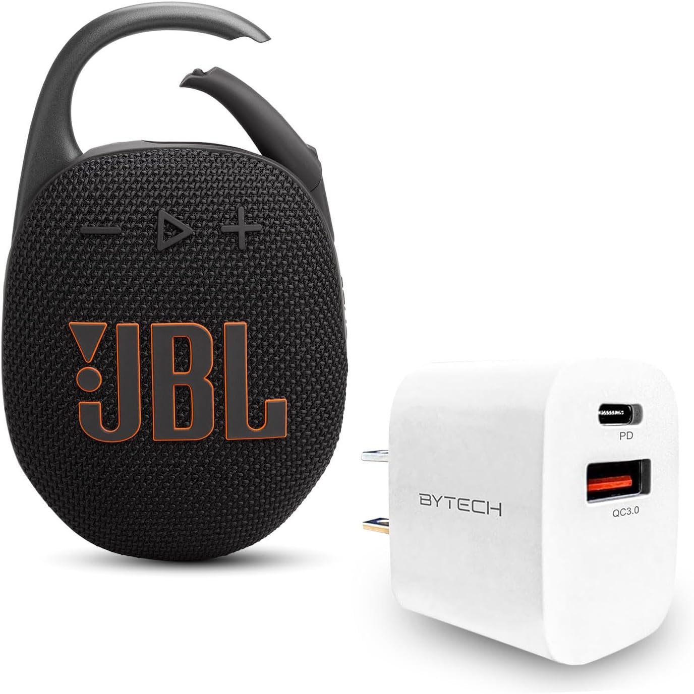 This bundle includes (1) JBL CLIP 5 portable bluetooth speakers in Black, and (1) Bytech AC Wall adaptor