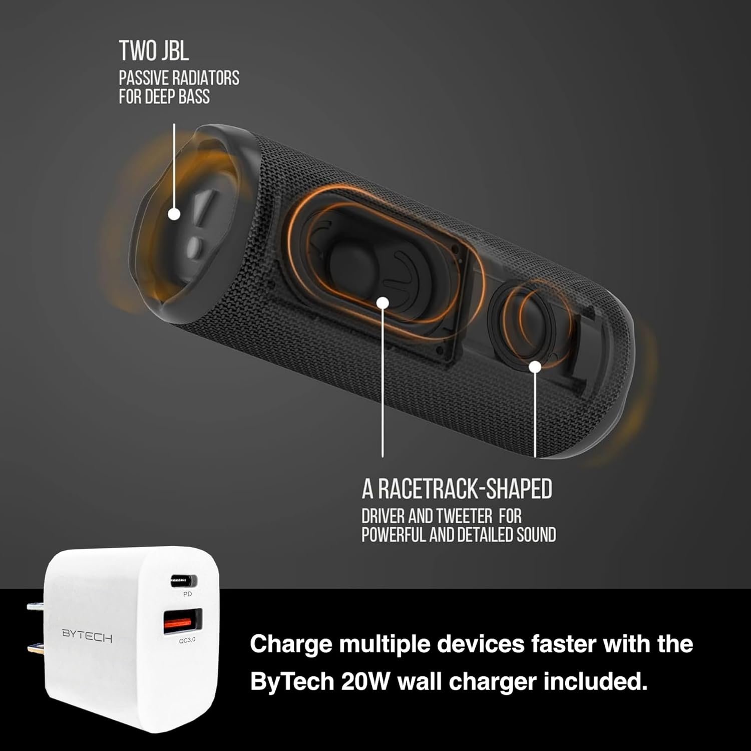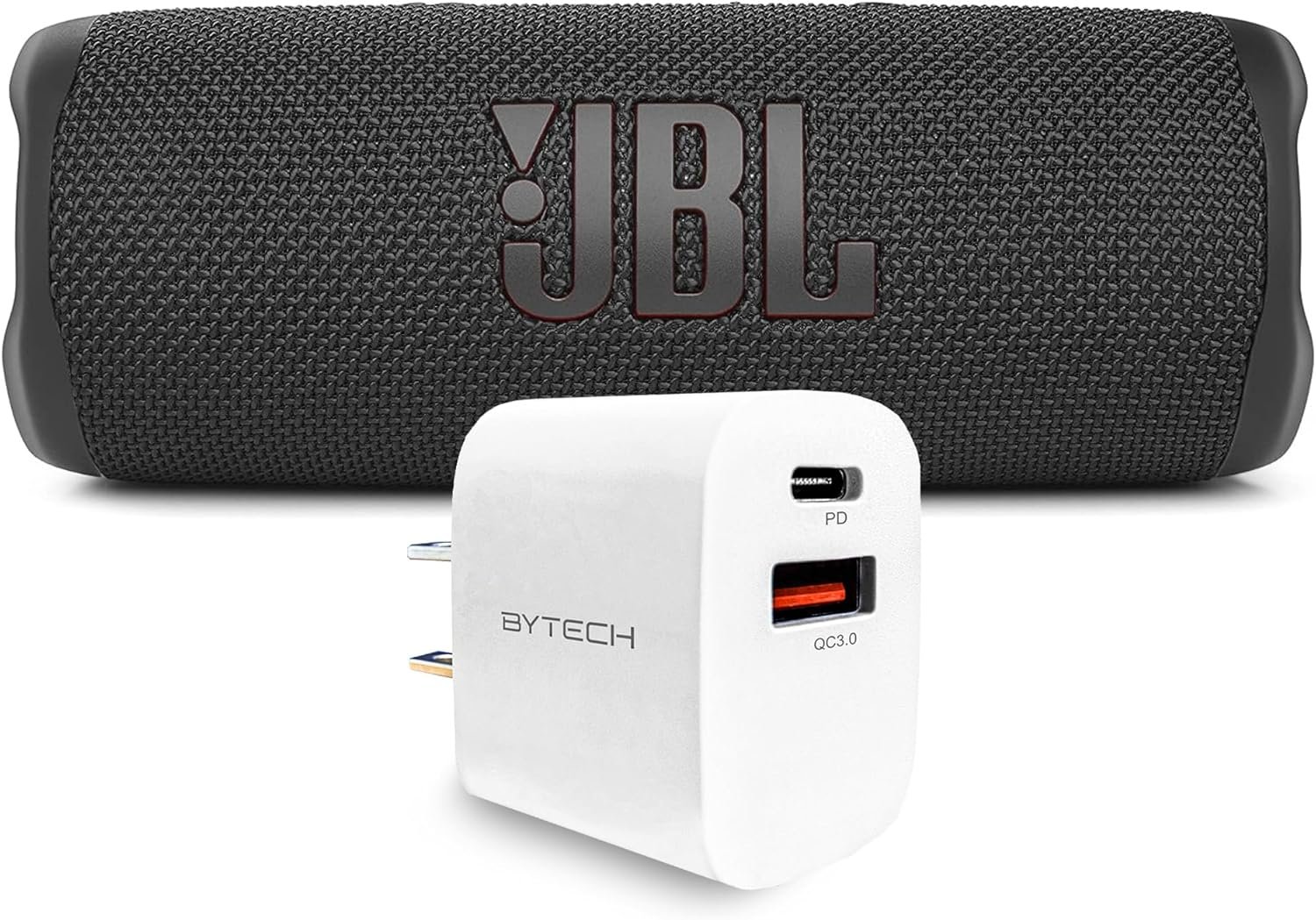 SPEAKER + CHARGER – This bundle includes one (1) JBL Flip 6 in black and one (1) ByTech Universal 20W PD QC Wall Charger in white.