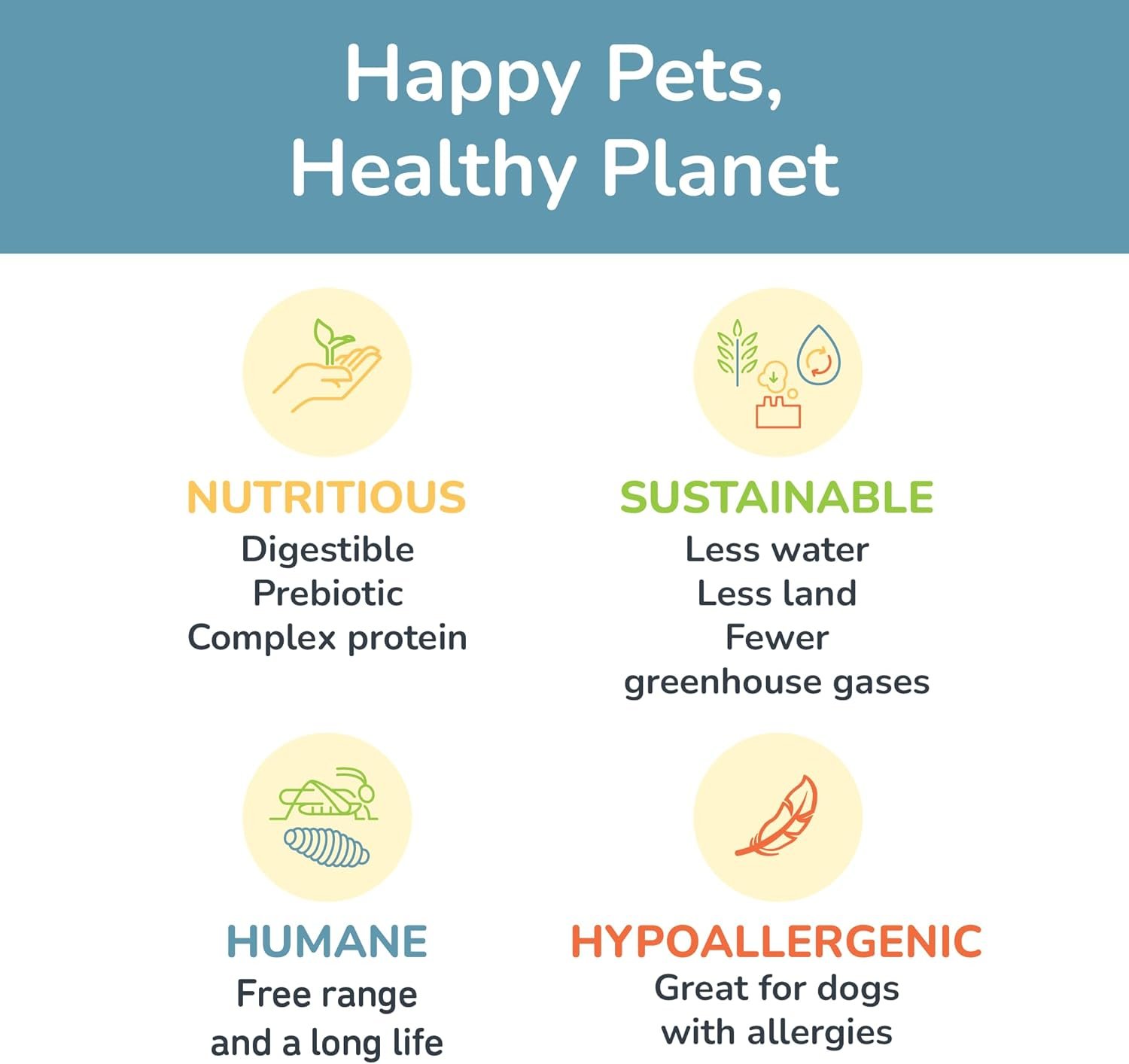Insects are a sustainable protein source using exponentially less land, water, feed and far fewer greenhouse gases than traditional protein. If you take a dog who is eating a chicken-based diet and switch to an insect-based diet, you save 480,000 gallons of water per year.