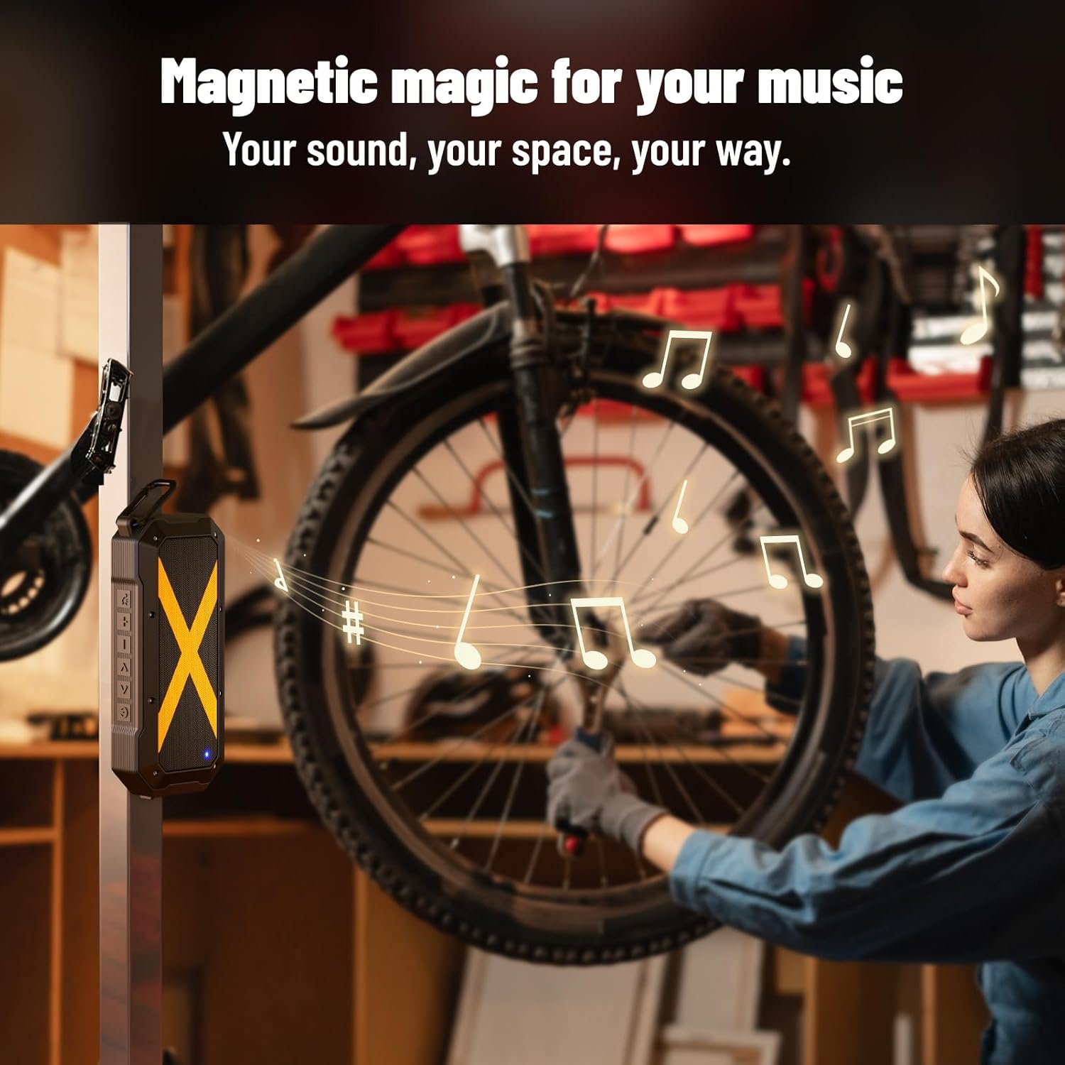 1. Built-in magnets Versatile Mounting Options. The innovative magnetic design eliminates the need for additional mounting accessories, making it simple to attach the speaker to golf carts, fences, or any other metal structure. This versatility ensures you can always enjoy your music in the perfect location.