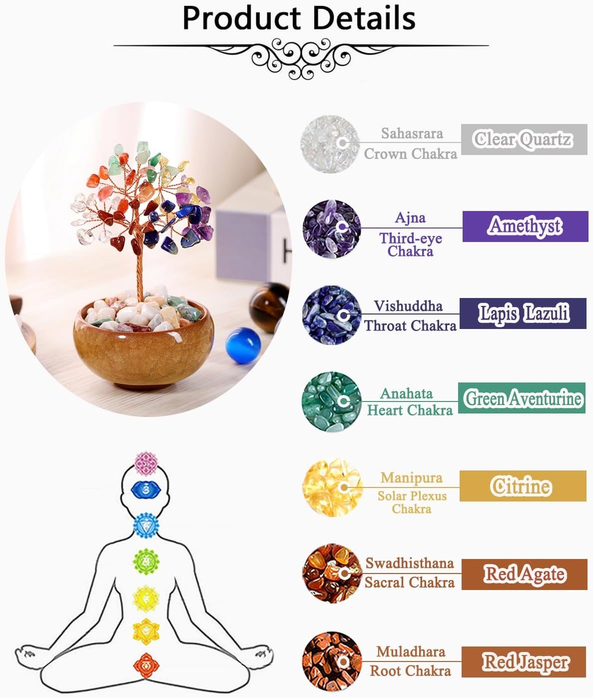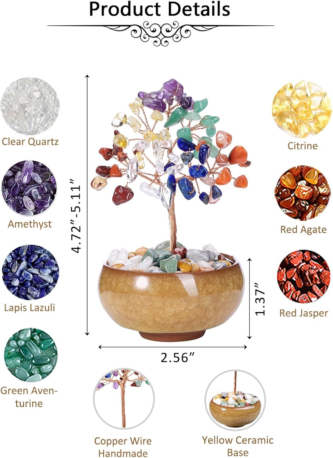 7 Chakra Tree Of Life:7 Chakras are energy centers in our body in which energy flows through in balance with each other. An unbalanced energy field may cause a blockage in the flow of energy7 Different colors are related to each chakra, and therefore you can adapt stones to the chakra according to the color of the crystal.
