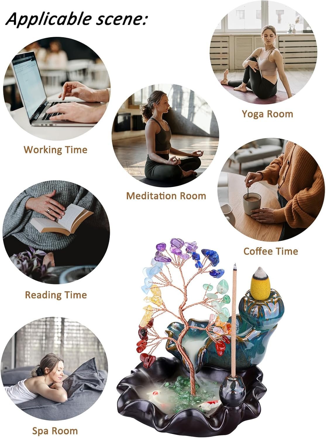 【Good Luck Incense Holder】The Crystal tree can be inspired and encouraged to help you find strength and stability. 7 Chakras are energy centers in our body in which energy flows through in balance with each other. And improve your thinking and health. Help people relax Spiritual , focus, increase wisdom, improve work efficiency and learning ability.