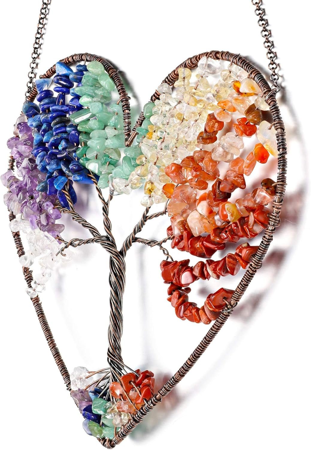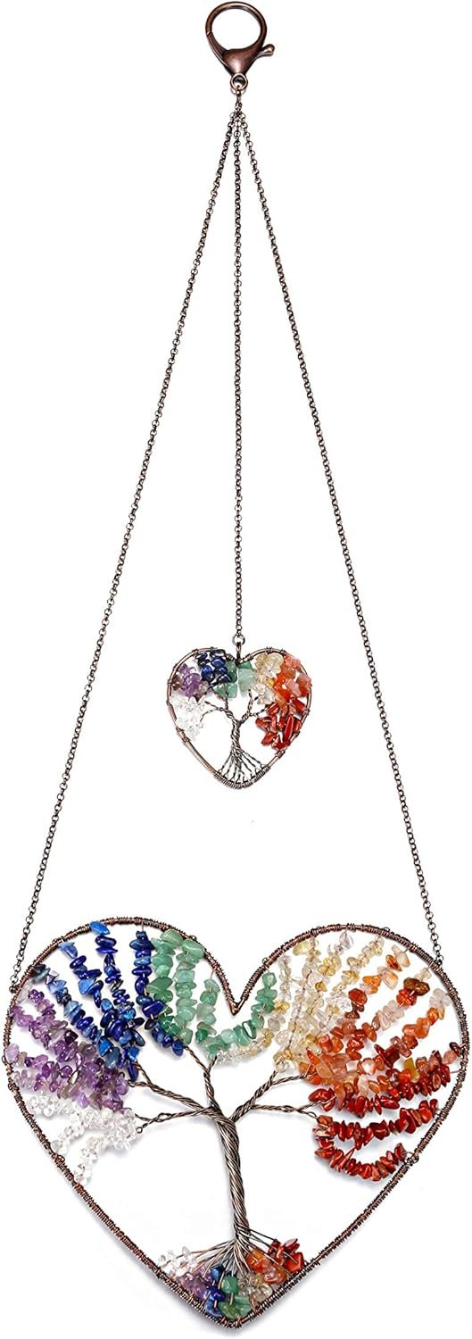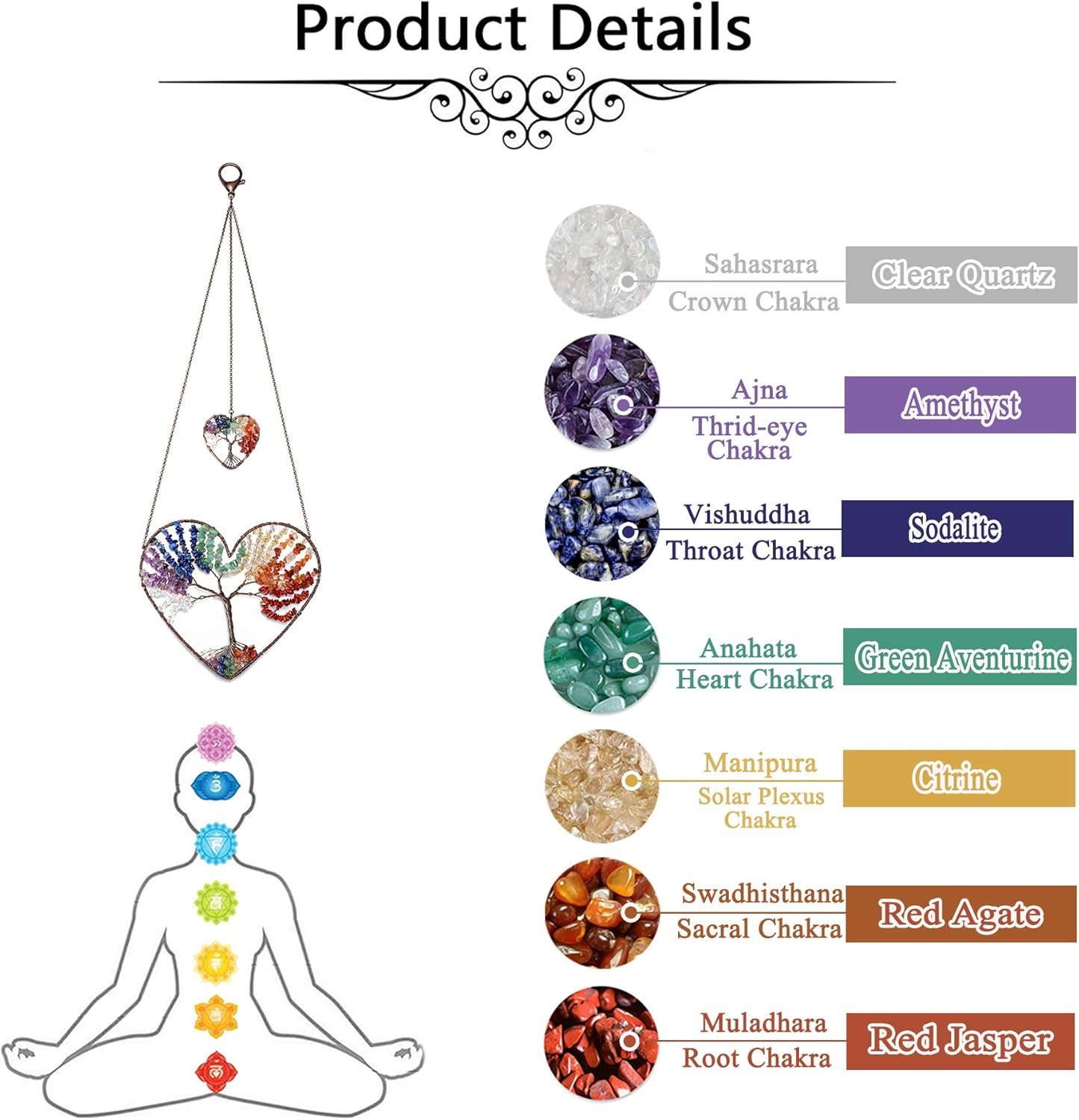 7 Chakra Healing Crystals Hanging Ornament: Clear quartz,Amethyst,Sodalite,Green aventurine,Citrine,Red Agate & Red Jasper, the metal is antique copper; Big Heart Tree Life Pendant Diameter: 4.92 inches x 5.51 inches; Small heart: 2 inches x 1.77 inches; Chipped Stone size: 0.24-0.28 inches, Total Length: About 17.1 inches; Weight: about 95g. All stone are natural material, so the shape and color will be different.