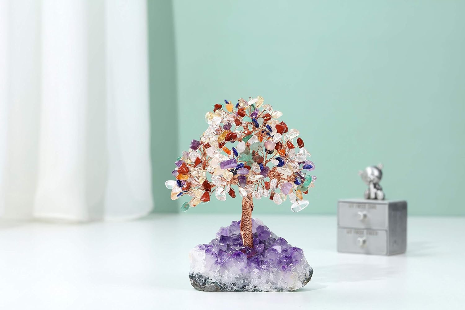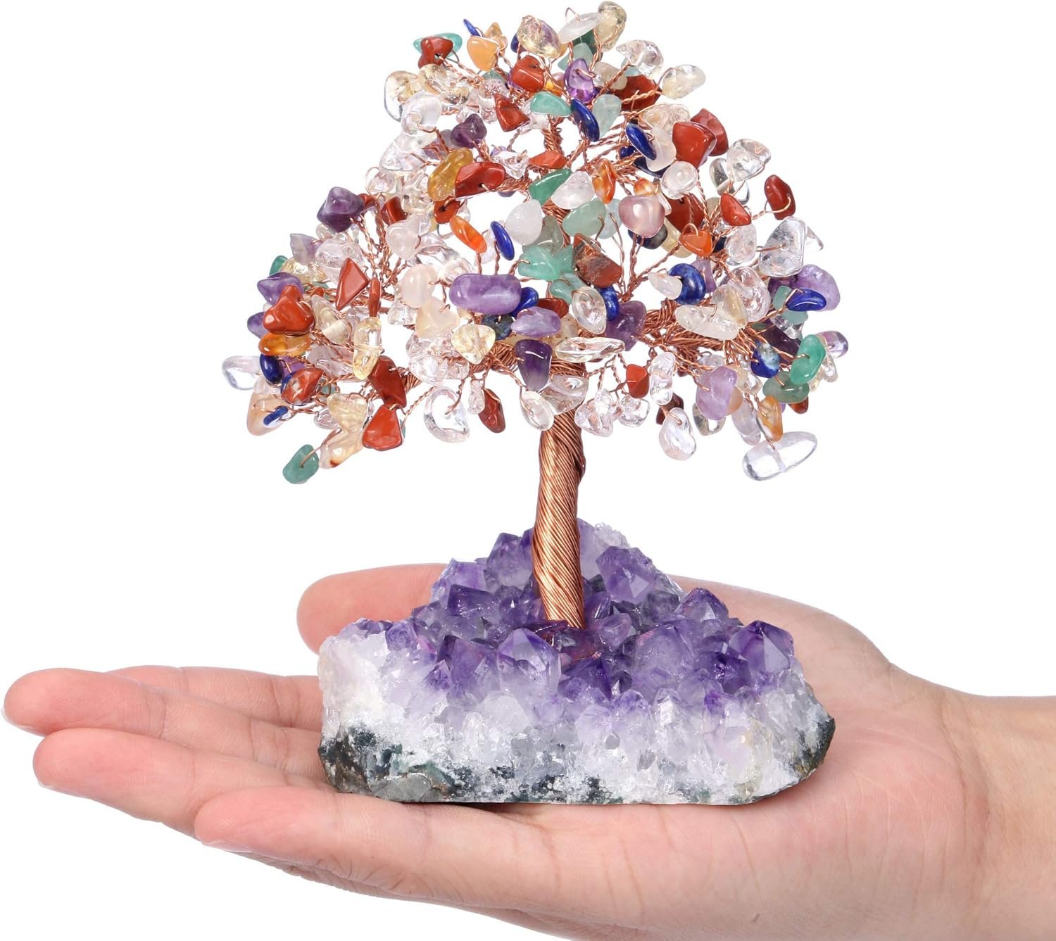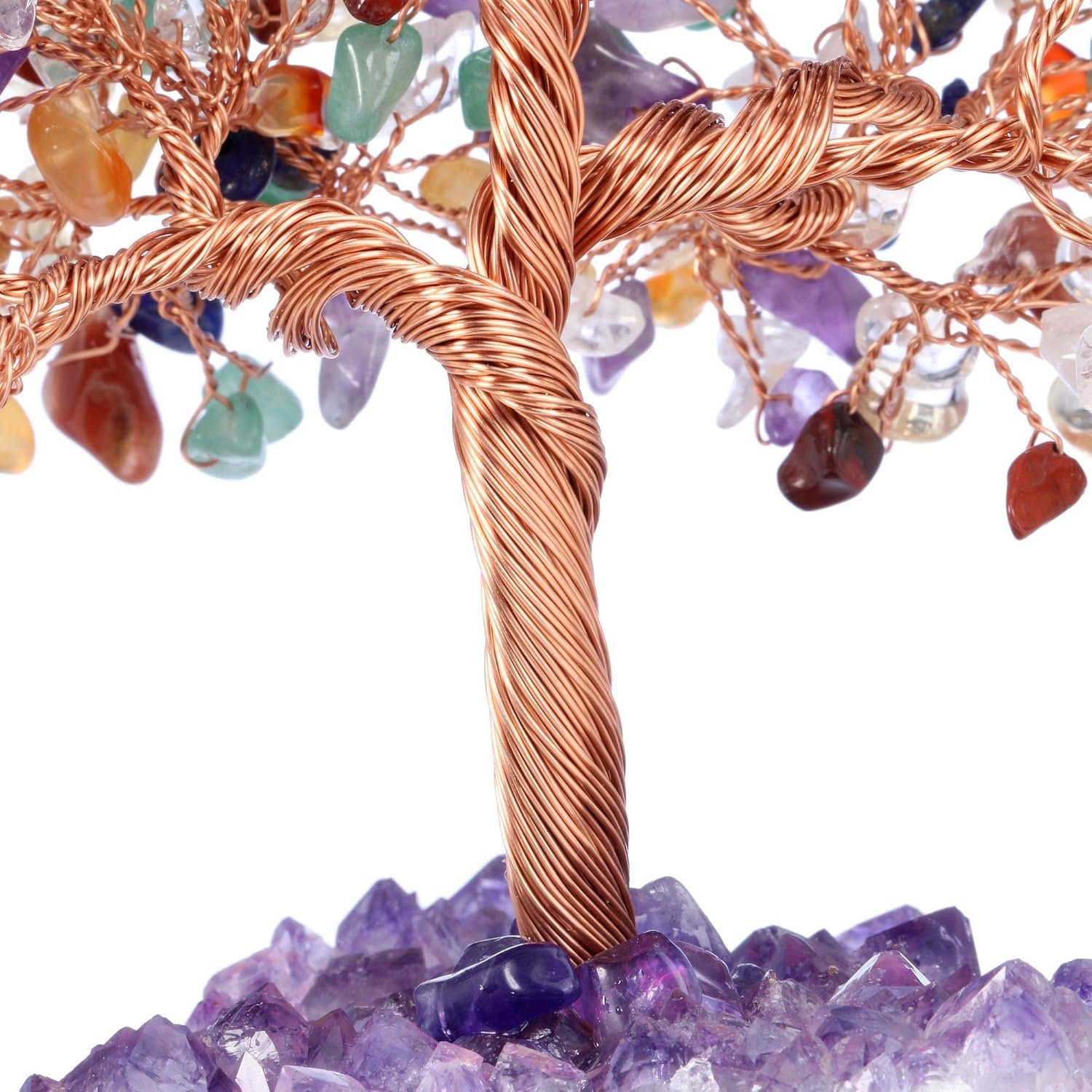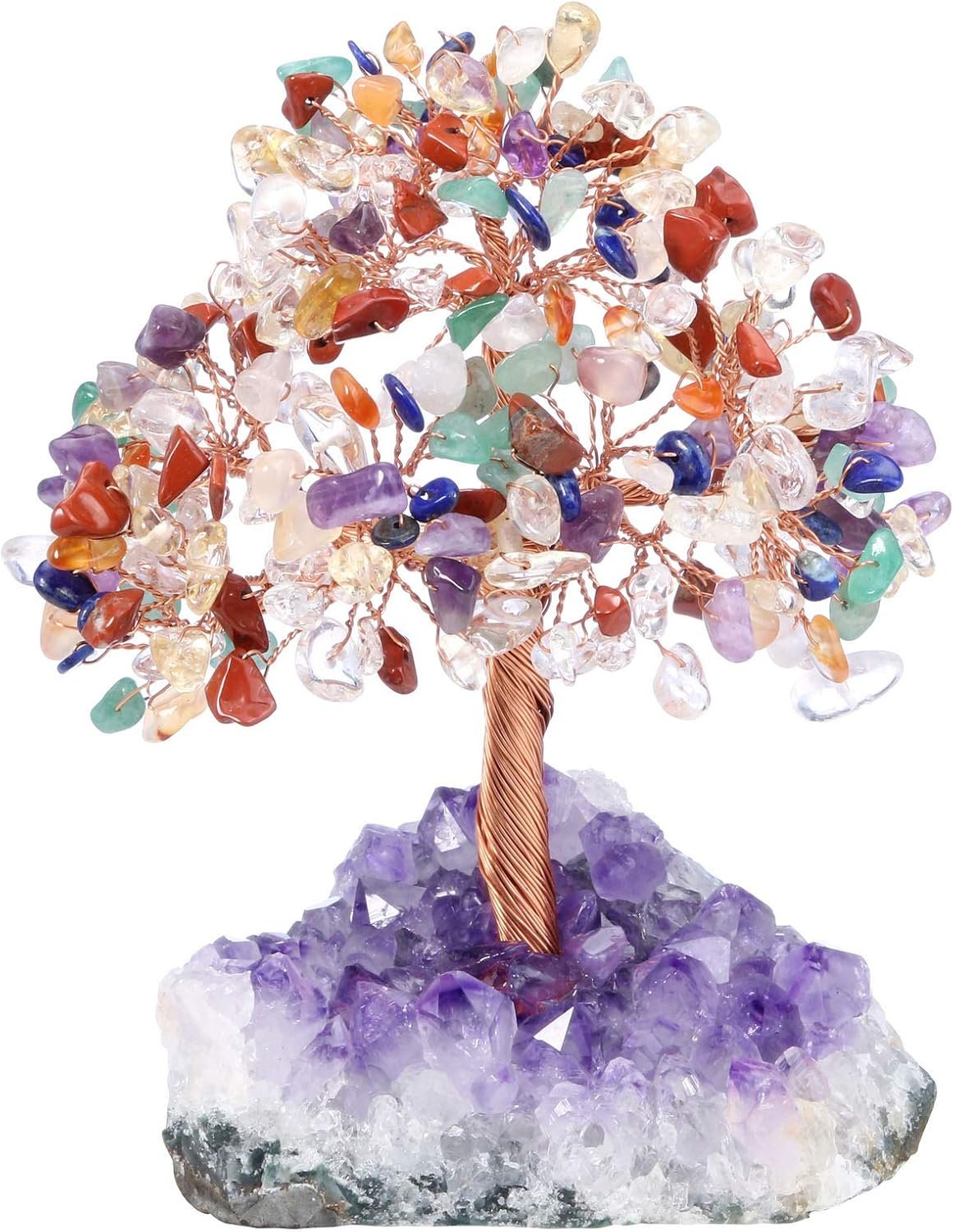 Handmade Lucky Stone Tree: Polished crystal stones stranded with the copper wire as leaves, copper wire folded as branches, fixed the root on a natural amethyst cluster base, thus forming a beautiful tree, which have the effect of collecting wealth, bring good luck and remove negative energy.