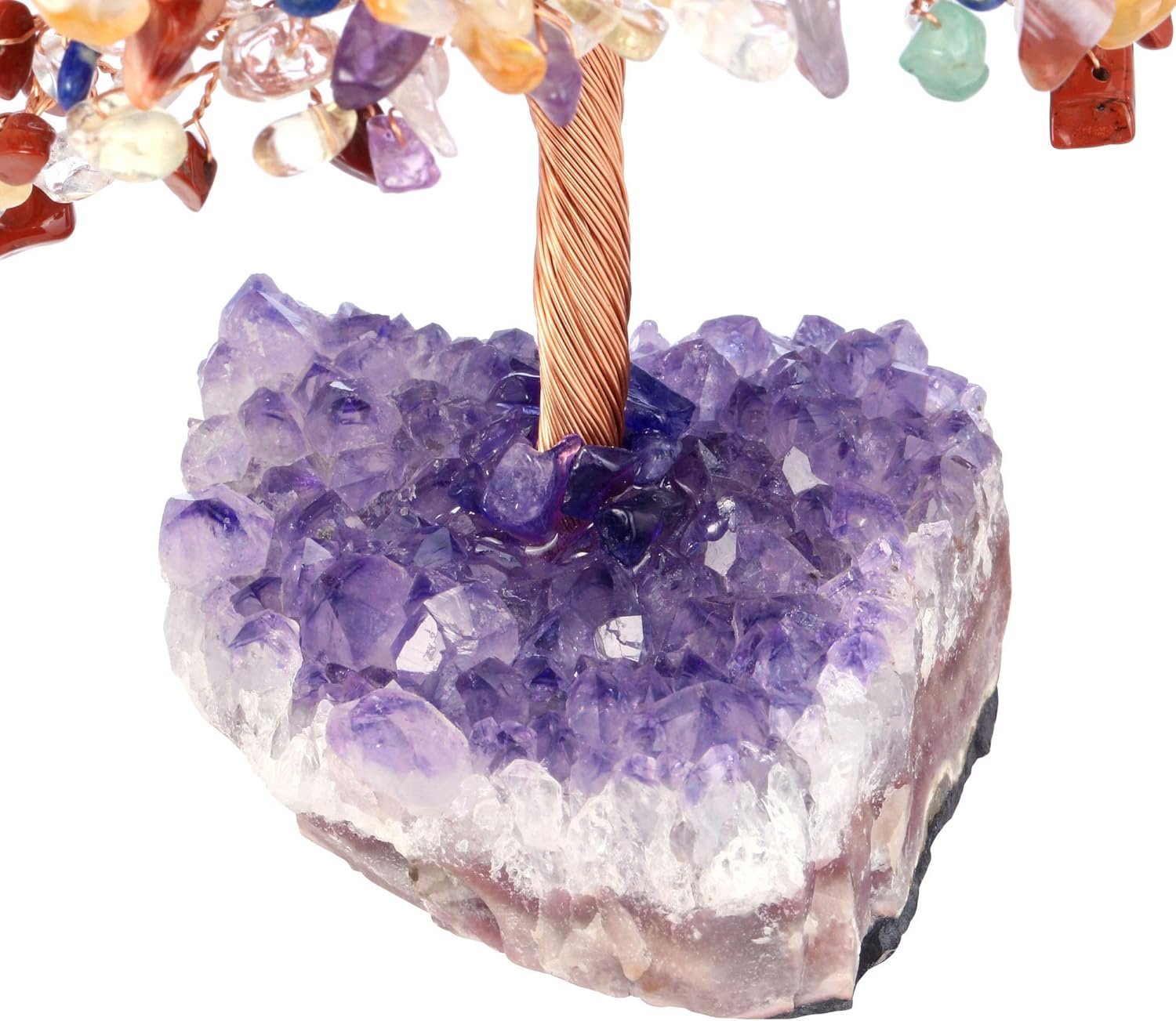 Jovivi Natural 7 Chakra Crystal Copper Money Tree with Raw Amethyst Cluster Base for Good Luck and Wealth Feng Shui Bonsai Spiritual Meditation Decor