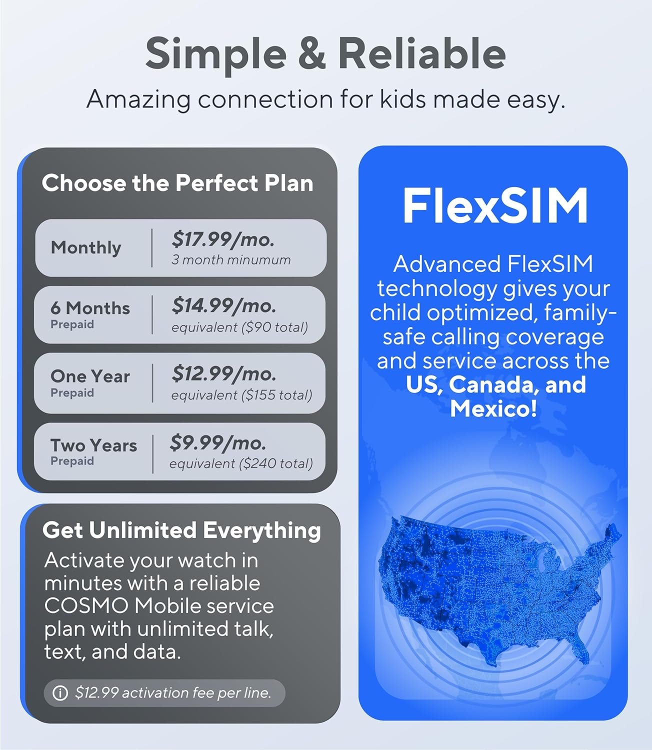 UNLIMITED TALK, TEXT, AND DATA –– Stay connected anytime, anywhere with COSMO Mobile Family-Safe service. Easily activate your watch’s pre-installed SIM card out of the box and choose from flexible and affordable cellular service plan options – starting at just $9.99/month equivalent with prepaid plans. (NOTE: JrTrack is not compatible with other carriers)