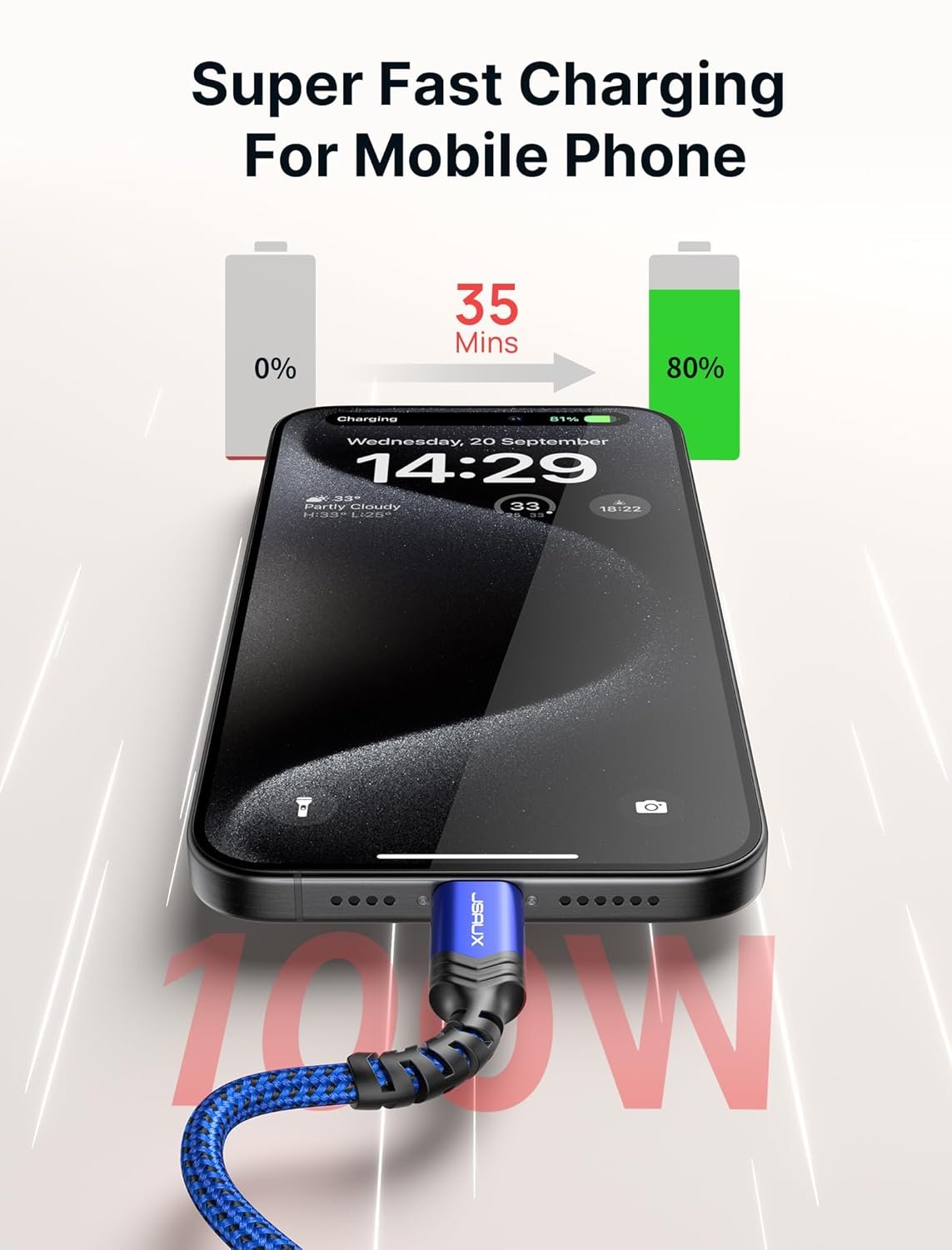 100W FAST CHARGING: The USB Type-C to Type-C cable supports up to 5A/20V super fast charging. Fast charge Samsung S23 up to 92% in 35mins. NOTE: The actual charging speed depends on your device and wall charger