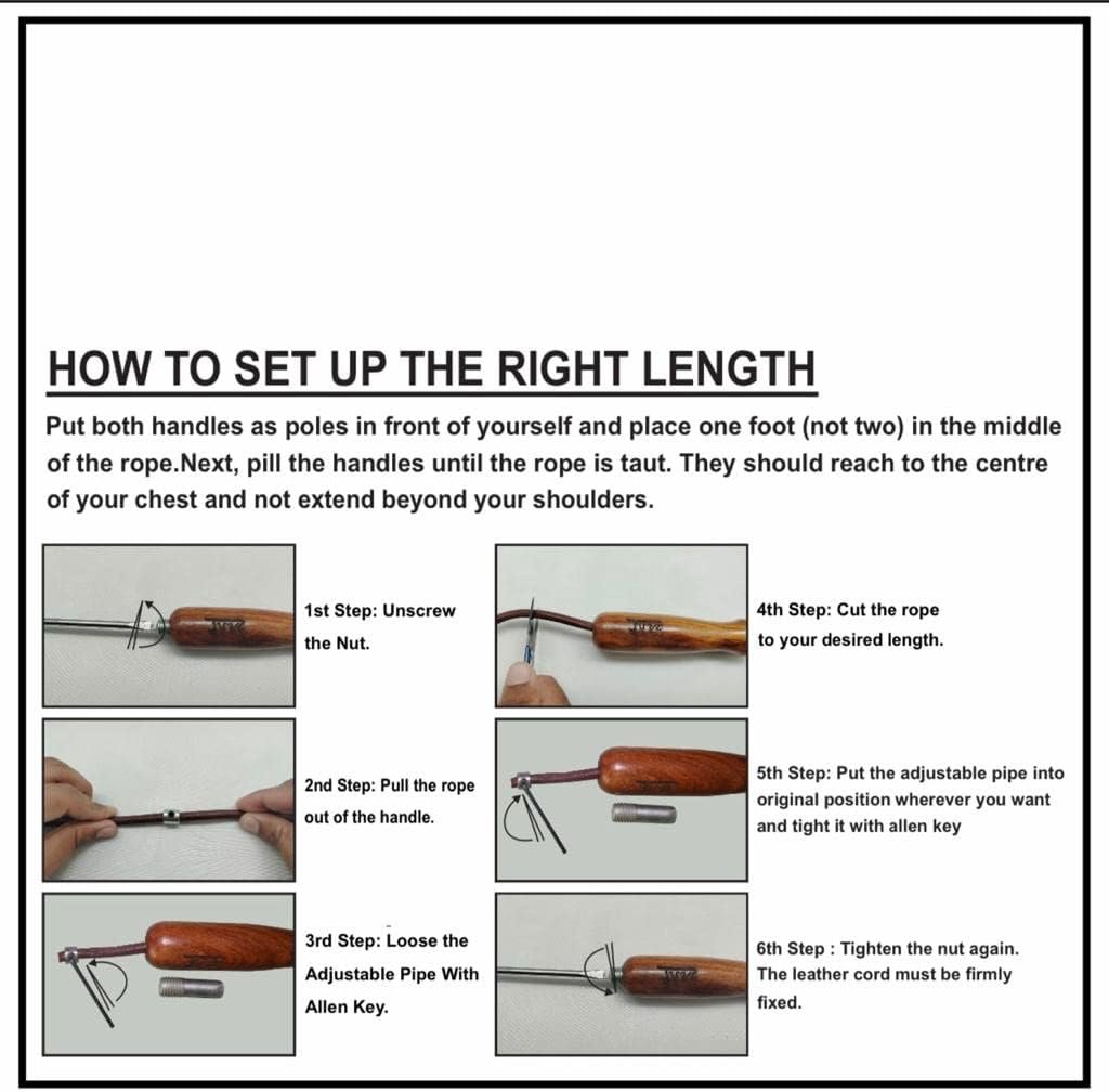 Jump Rope Juve is made up of natural components such as high quality wooden handles and genuine leather. This ensures long life of the jumping rope. Leather skipping rope has a length of 9 feel which can be easily adjusted according to your need by just using an Allen key to achieve perfect jump rope workout results.