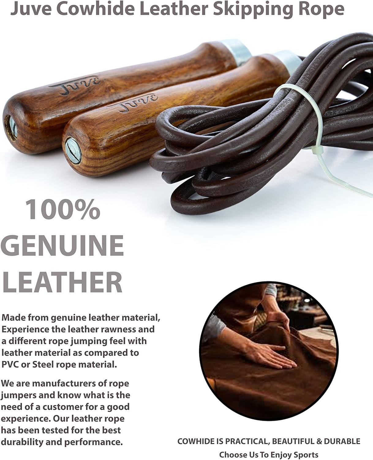 Juve Leather Jump Rope – Adjustable Jump Rope with Wooden Weighted Handles for Workout Fitness, Exercise, Skipping Rope Speed Rope Crossfit for Men & Women