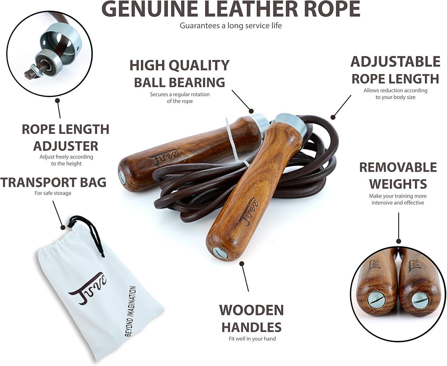 PREMIUM QUALITY MATERIALS : the Juve jump rope is made of genuine leather, high quality hardwood and stainless steel. These high quality materials make Juve jump rope look luxurious and ensure the jump rope’s durability. The Juve jump rope makes the perfect addition to you gym bag.