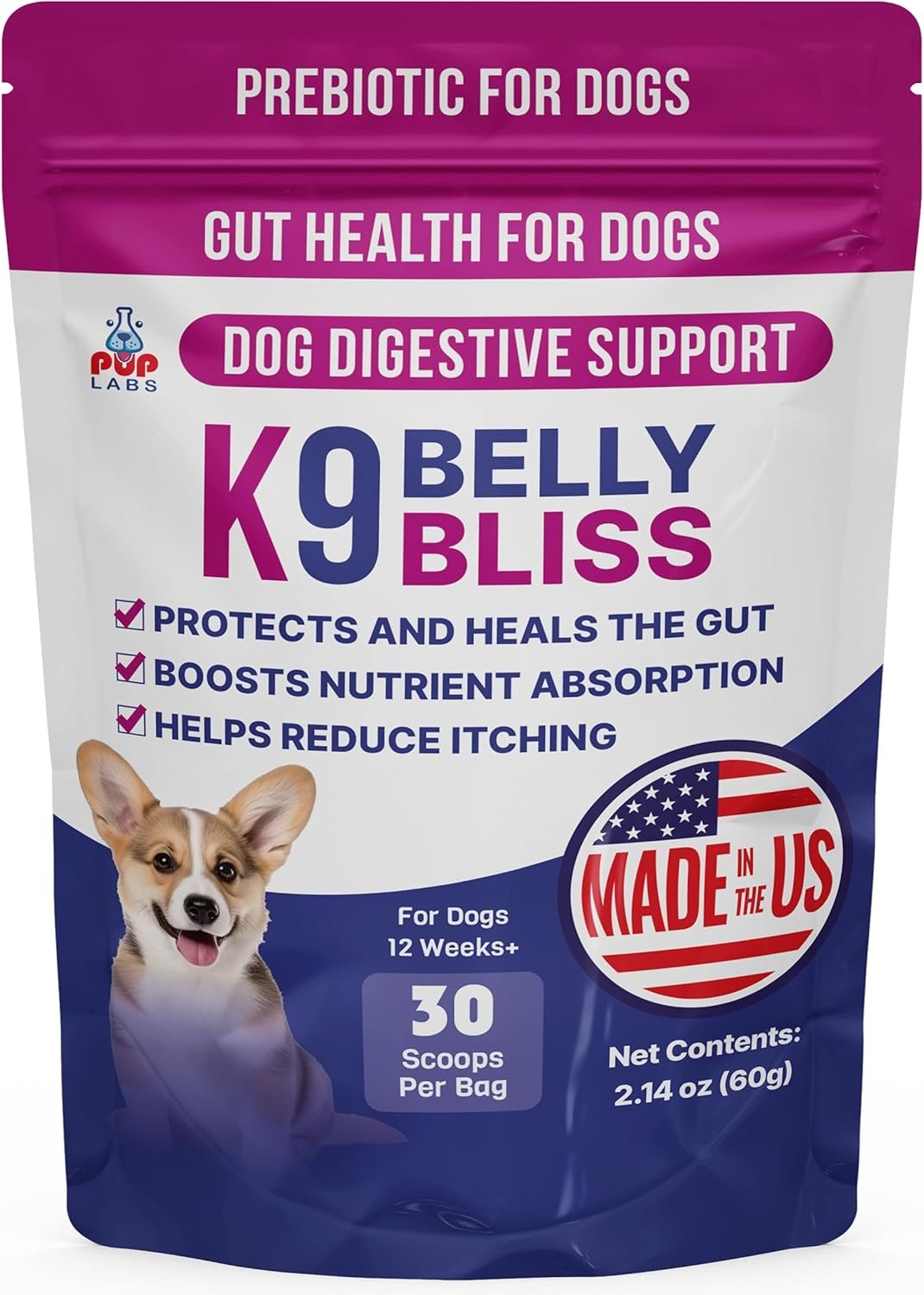 Vet-Approved & GMP-Certified Dog Prebiotics: K9 Belly Bliss is backed by trustworthy experts and produced to Good Manufacturing Practice standards, offering a safe and reliable supplement for dog gut health and dog gas relief.