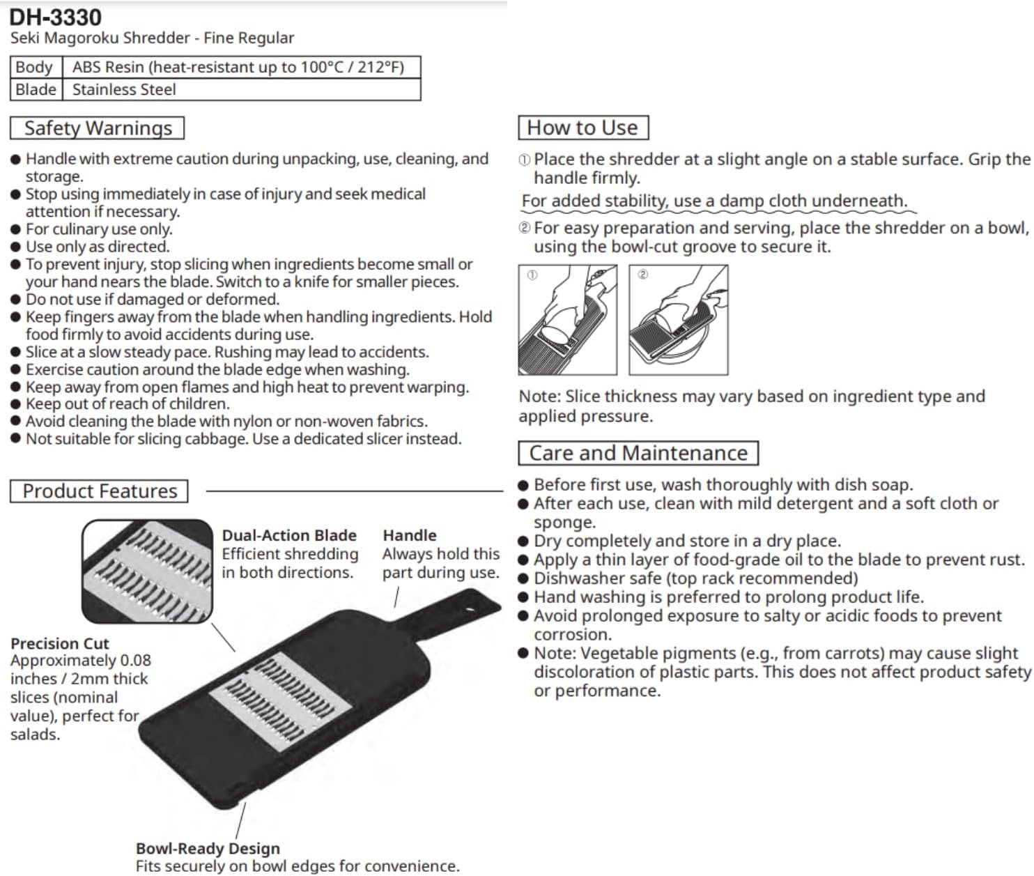 Material: Body: ABS resin (acrylonitrile butadiene styrene) (heat-resistant temperature up to 202°F (100°C)), Blade: Stainless steel