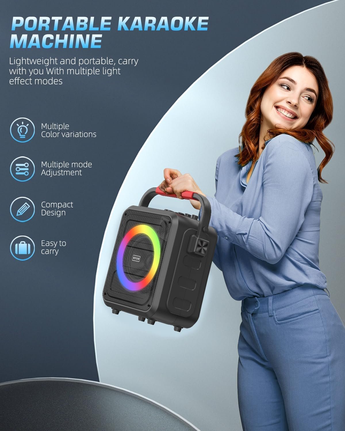 【Six Color Lighting Modes】This karaoke speaker comes with colorful RGB lights and multiple lighting effects, allowing you to switch between different coloured lights at will. Built in 6500mAh high capacity battery, improves battery life and lasts for 8-10 hours without stopping. Enjoy the joy of the party with colorful lighting and wonderful music.