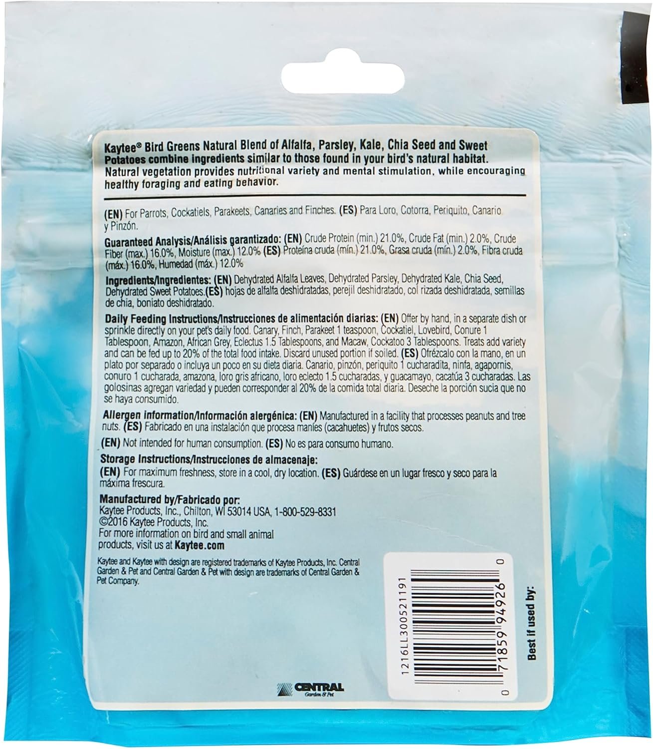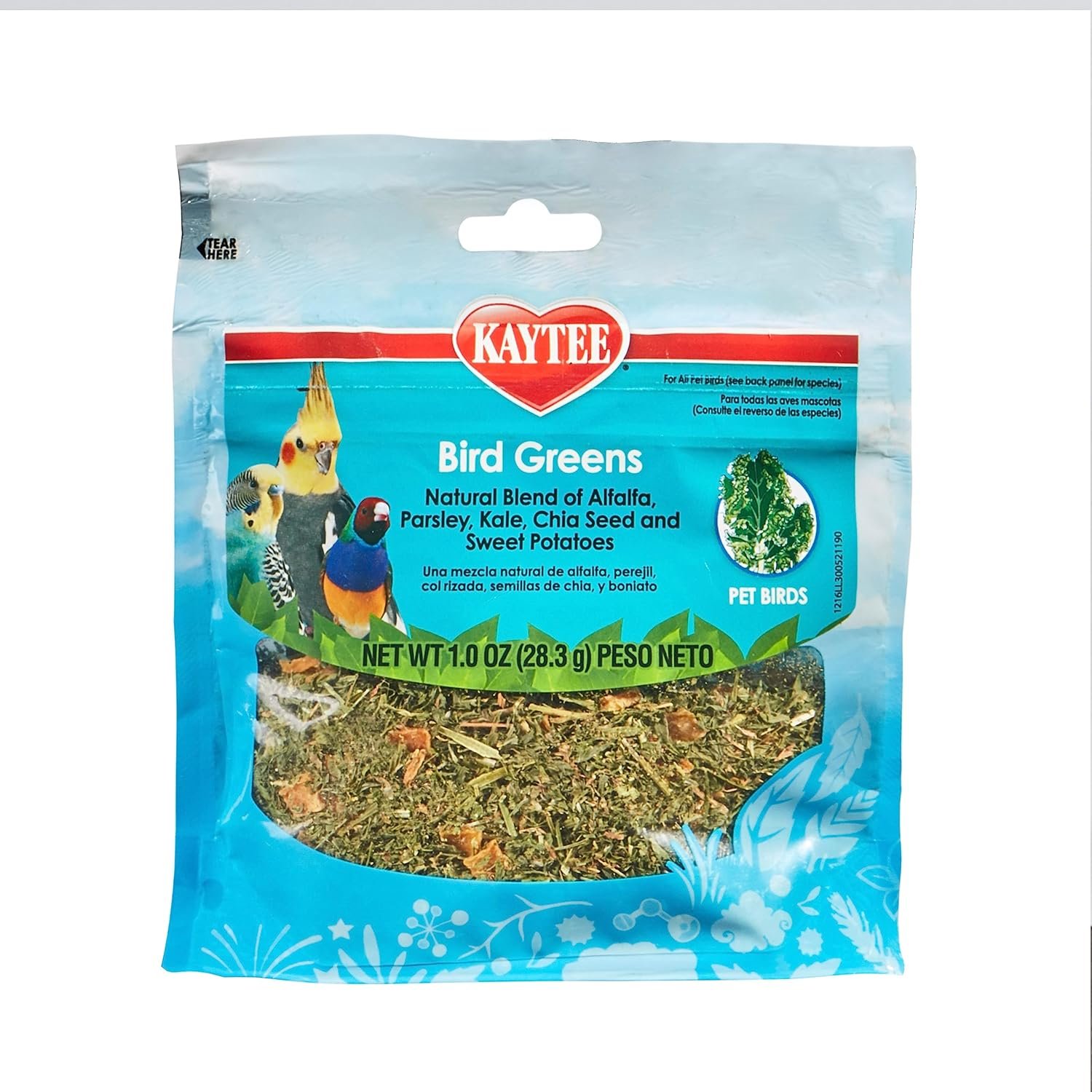 Kaytee Bird Greens offers a natural blend of alfalfa, parsley, kale, chia seed and sweet potatoes that provides nutritional variety and mental stimulation. Bird Greens encourage healthy foraging and eating behavior for your pet bird. This treat is great for Canaries, Finches, Parakeets, Cockatiels, Lovebirds, Conures, Amazons, African Greys, Pionus, Cockatoos, and Macaws.