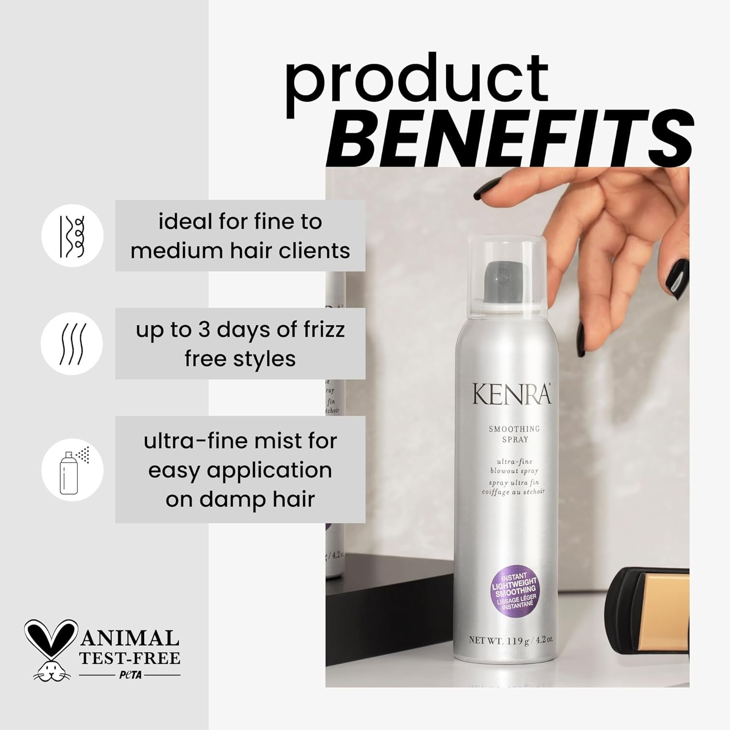 Smoothing products provide frizz reduction but can be heavy for finer hair. Smoothing Spray smooths fine/medium hair without weighing it down for up to 3 days of frizz control and humidity resistance. Ultra-fine mist allows for even application while providing thermal protection and enhanced shine.