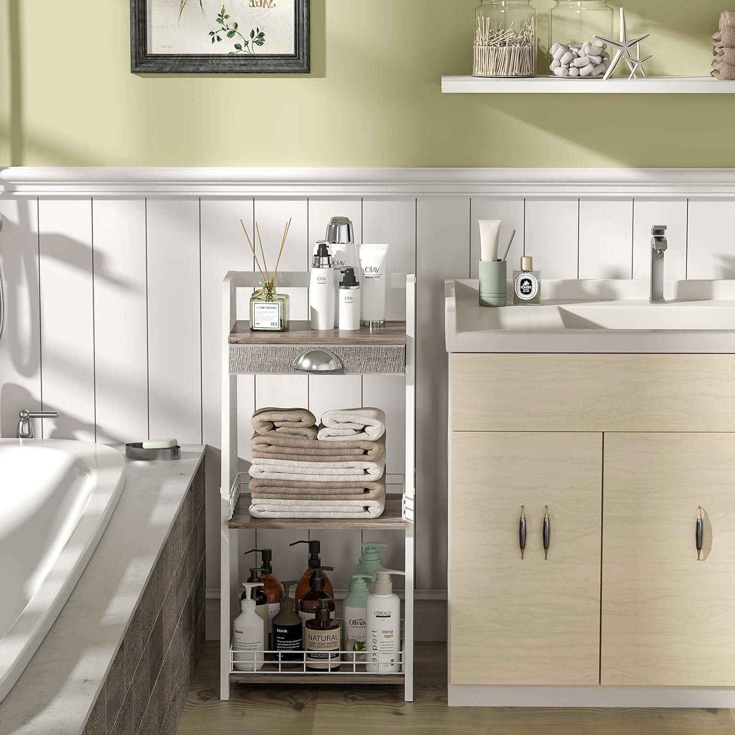 keomaisyto 3-Tier Bathroom Ladder Shelf, Floor Storage Shelf with Drawer, Freestanding Open Tower Shelving Unit for Bathroom Living Room Balcony(White)