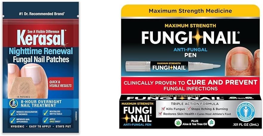 Treat toenail fungus overnight while you sleep and prevent future outbreaks with this bundle containing Kerasal Nighttime Renewal Fungal Nail Patches and Fungi-Nail Pen Applicator. The Kerasal patches provide a hygienic 8-hour nail treatment. These overnight patches deeply penetrate to moisturize and exfoliate the nail, reducing discoloration and smoothing 14 patches over 3-6 months. Fungi-Nail pen delivers maximum strength antifungal medication with 1% Tolnaftate plus nourishing essential oils. Its targeted applicator reaches fungus around nails and feet, stopping infection spread. Used together, these complementary products restore nail appearance and health, cure fungal infections, and prevent future outbreaks. The convenient patches treat nails overnight. Then the easy-to-use Fungi-Nail pen provides daytime prevention and infection cure where accessible around nails. With nighttime treatment and daily prevention, this bundle offers a complete toenail fungus regimen to reveal your healthiest nails.