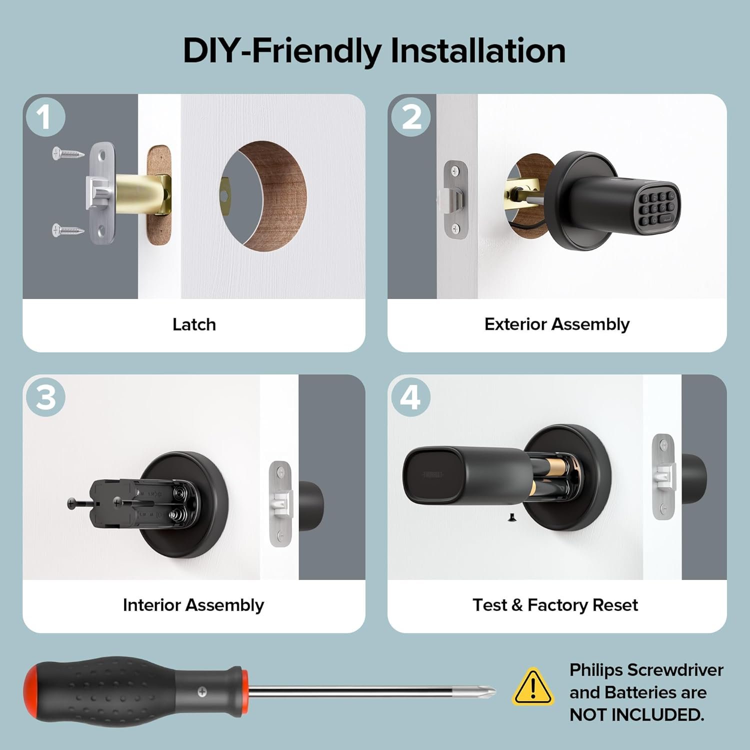 DIY Friendly & Effortless Setup. Upgrade your security in minutes following the 4-step installation using a Philips screwdriver. This keyless door lock fits most US doors. Using 4 x AA Alkaline batteries (NOT included) from a well-known brand could provide up to 1 year of battery life. If the battery runs out, you can connect your power bank to the Type-C port located on the bottom to power it on, or use backup keys to unlock