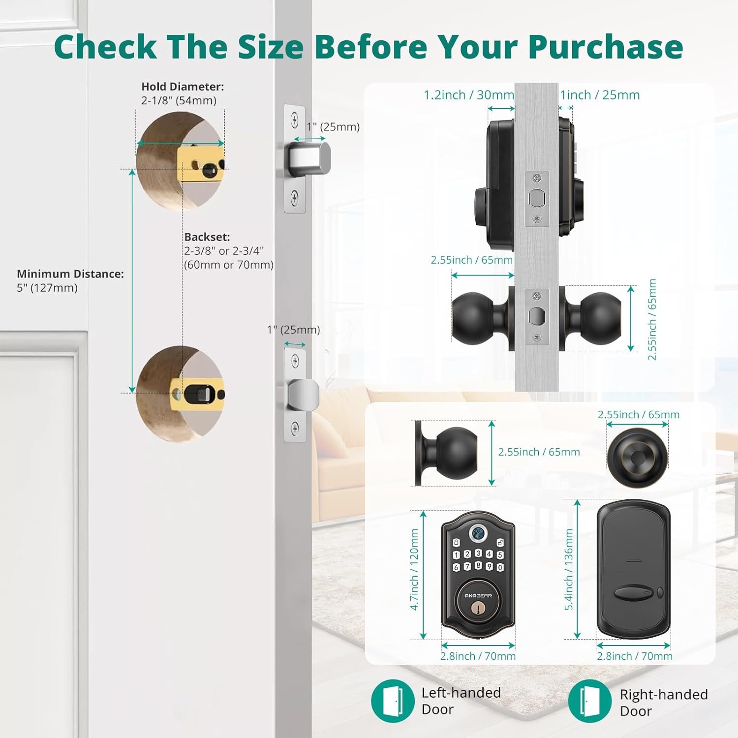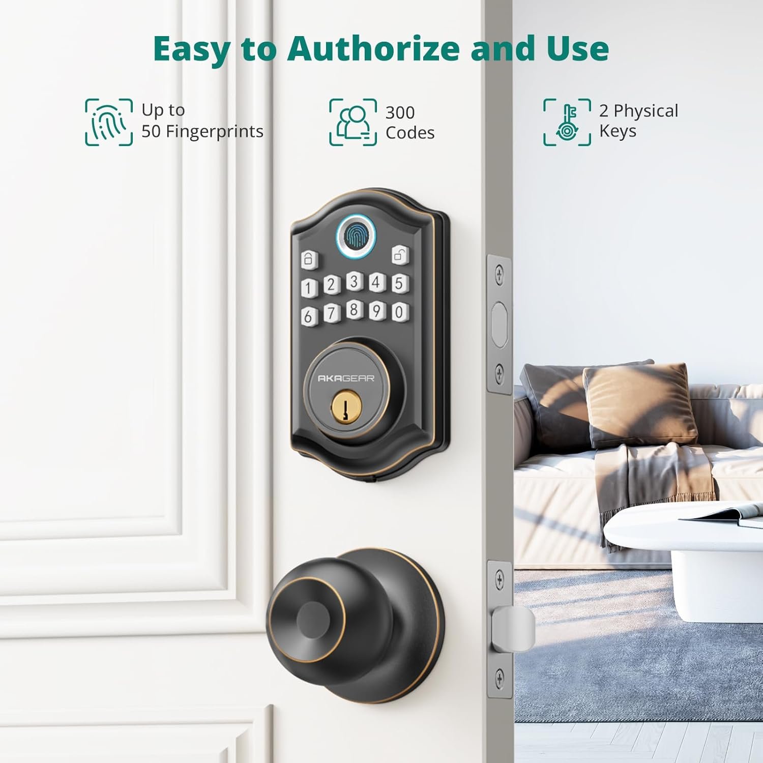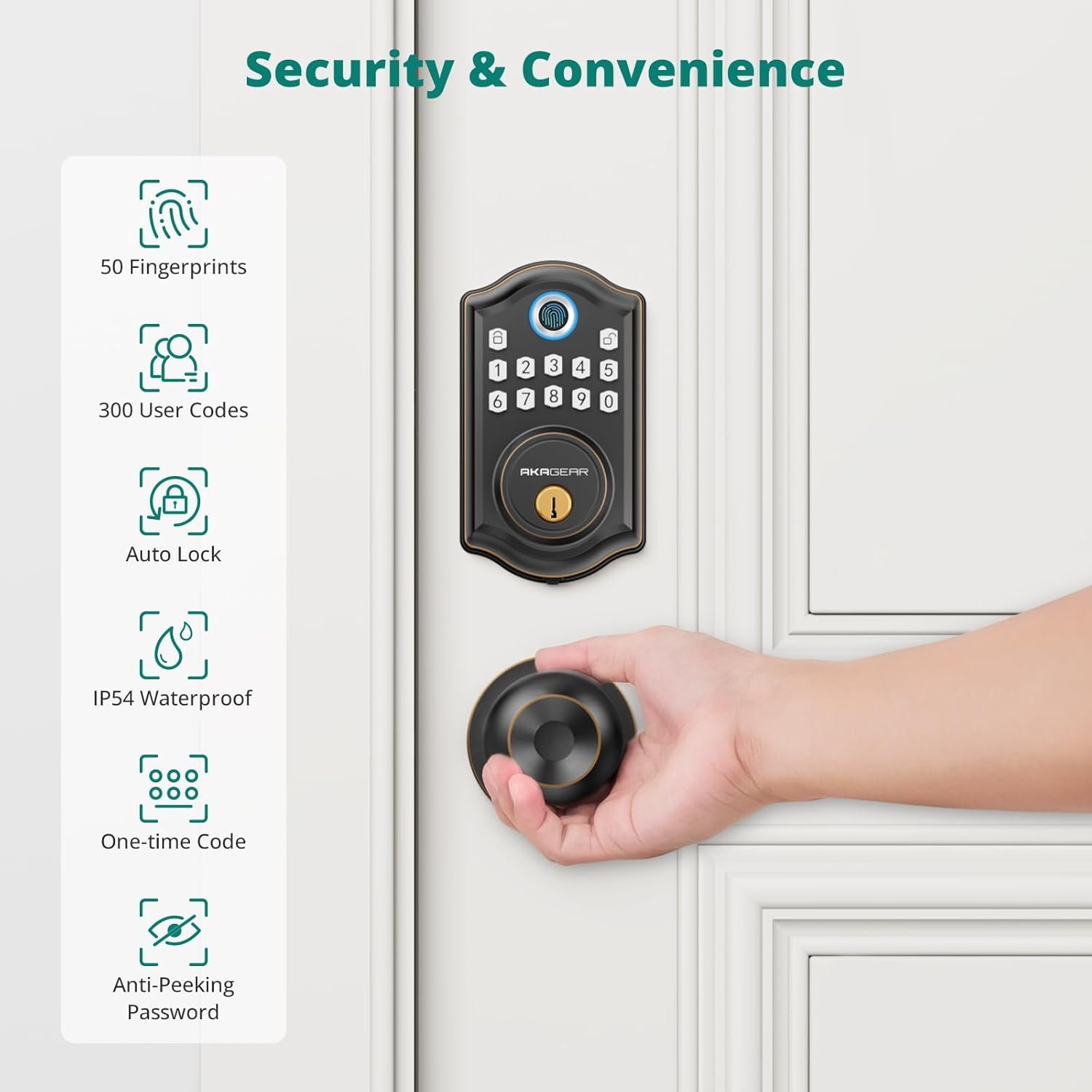 User-Friendly of Keyless Entry: AkaGear’s DS10 fingerprint smart door lock offers unparalleled convenience and security features. With up to 50 user fingerprints and 300 access codes, create temporary codes for guests. Additionally, it comes equipped with two spare keys for family members, further enhancing accessibility and peace of mind.