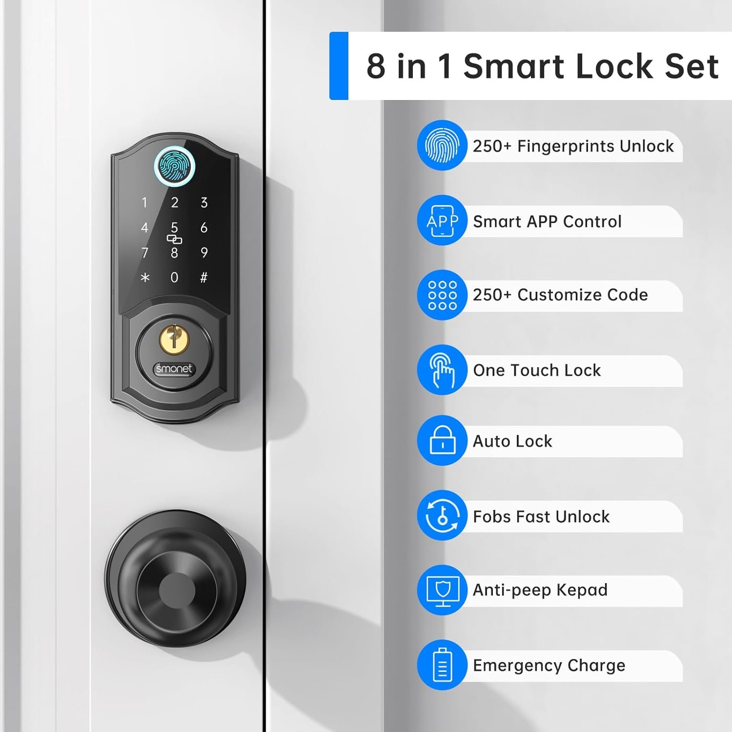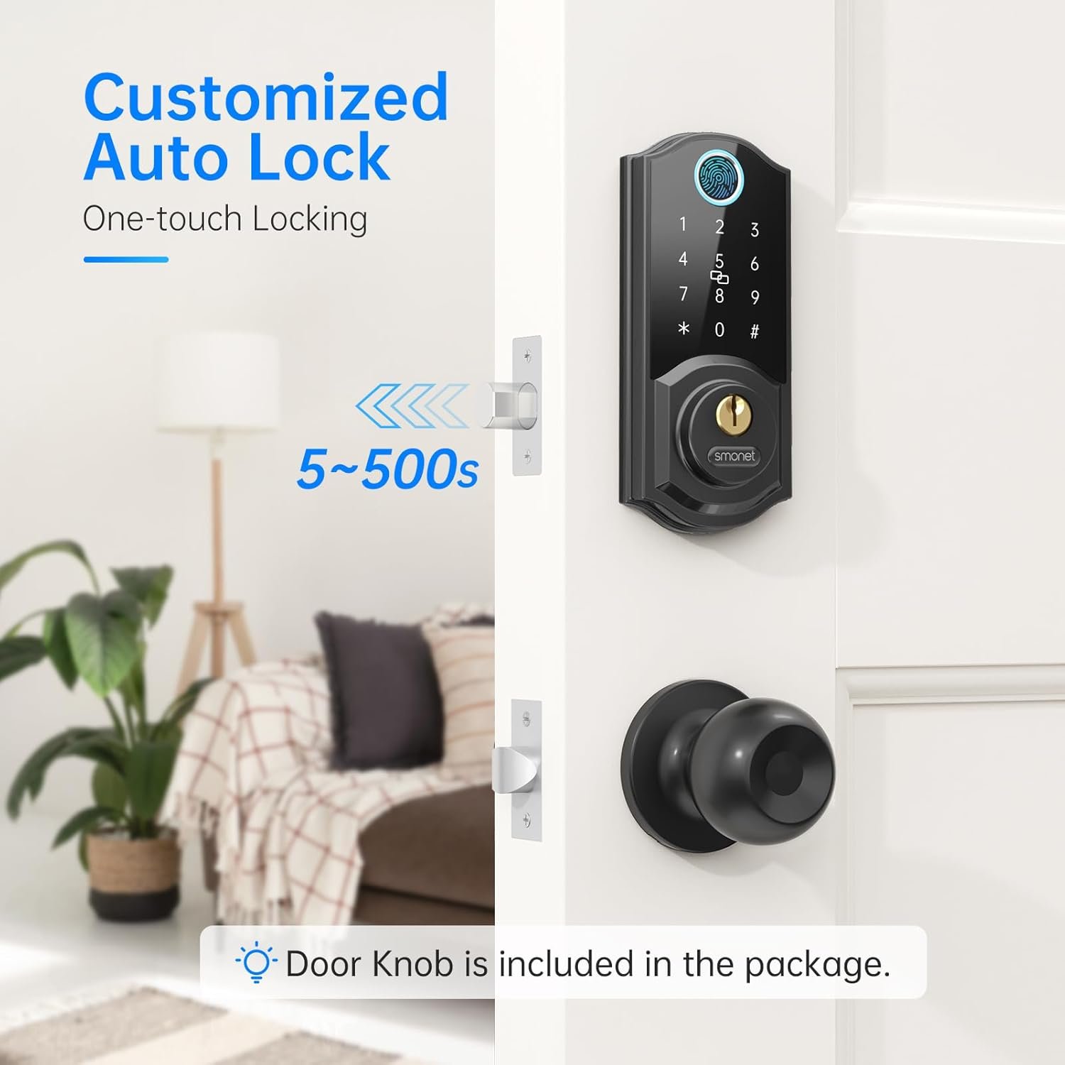 10 in 1 Secure Keyless Lock Set: The front door lock with knob set offers fingerprint / app / passcode / key fobs / mechanical keys / auto lock / E-Key / knob set / remote control /Smart voice control (requires extra hub).With all these options, you never have to worry about losing your keys and getting locked out. Simply choose the best unlocking method that suits your needs.