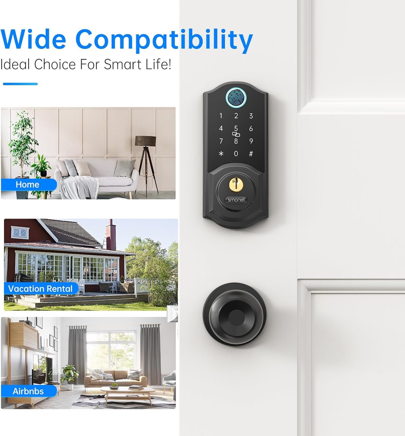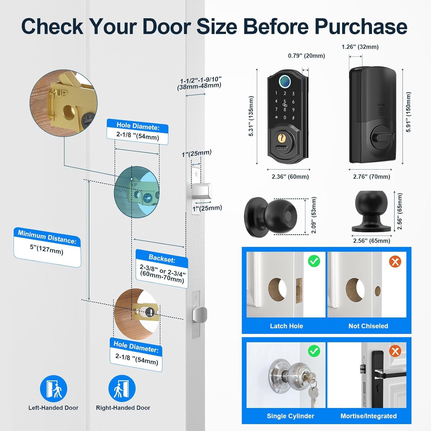 Secure Turn Knob: Equipped with two turn knobs and a keypad deadbolt, the smart fingerprint door lock offers auto lock or pass through mode.Perfect protection for the security of your home.