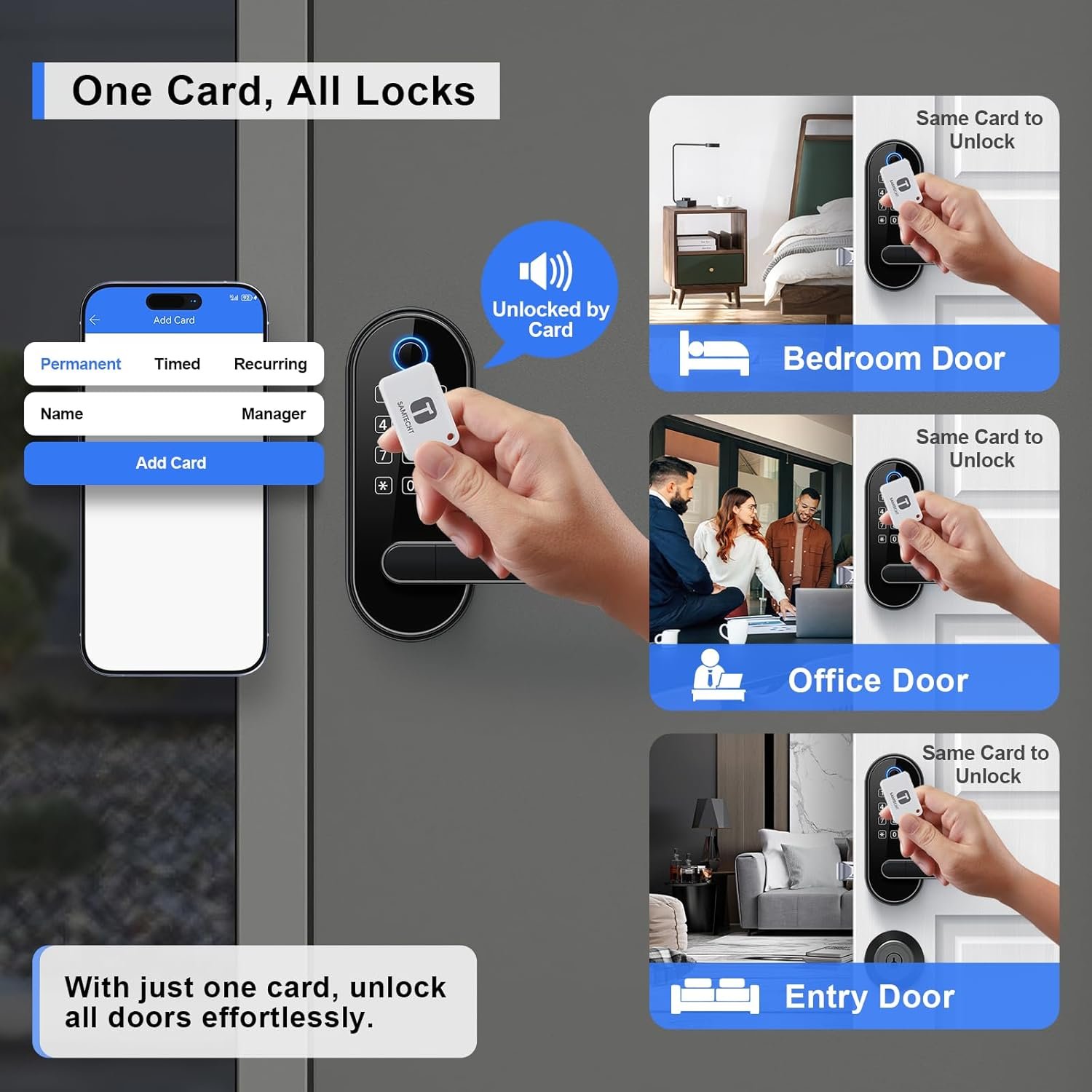 [One Card, All Locks] Use one card to unlock all doors, eliminating the need to carry multiple keys and the confusion of which key is for which door; this feature is especially friendly for property managers who manage many properties.