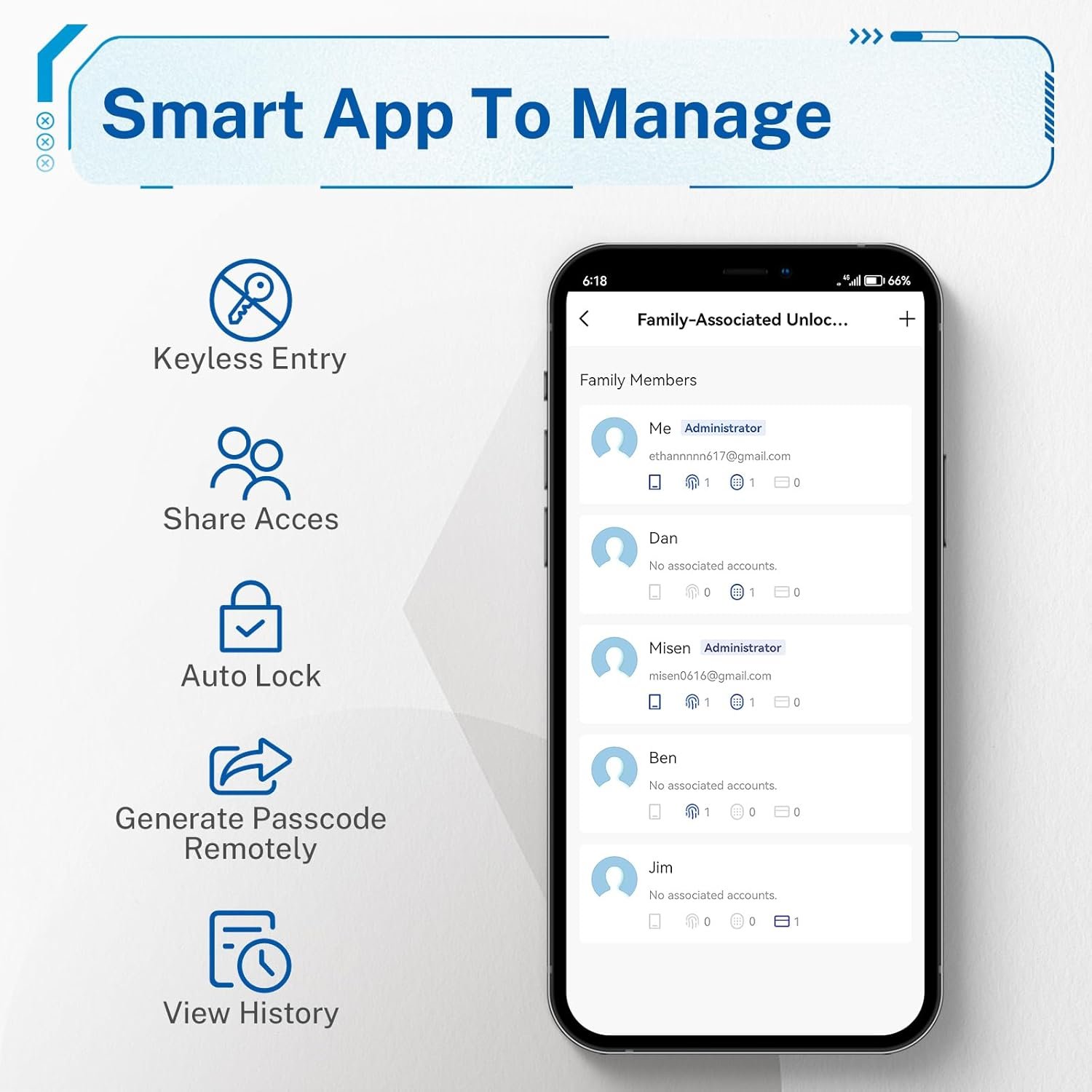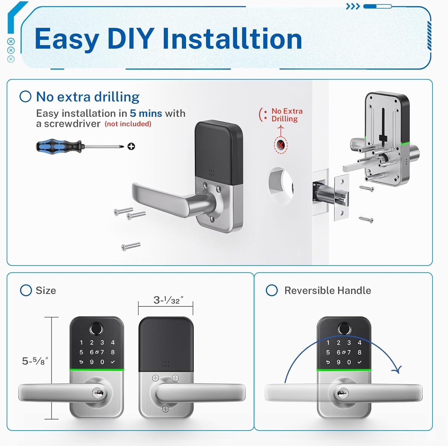 🔥【Multiple Keyless Access】Enjoy fingerprint + pin code + smartphone app + key fob + mechanical keys, what’s more, you still can use Alexa voice (Wi-Fi Gateway required) and remote unlock (Wi-Fi Gateway required) for your door. This multifunctional smart lock provides personalized access for your children, elderly family members. Versatility at its finest!