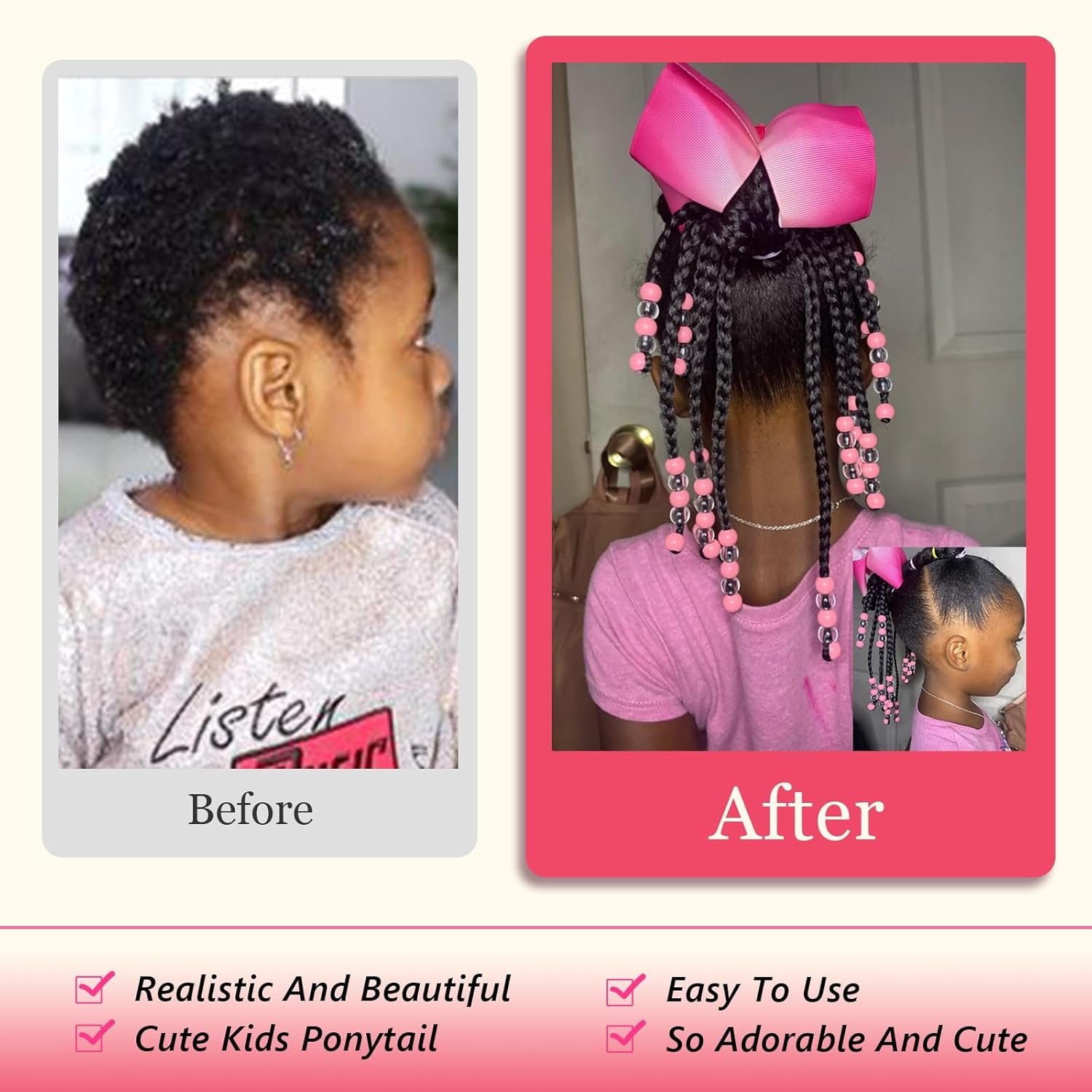 Beautify Your Daughter: Nice Head Accessory. The Braid Ponytail Is Not Just a Cute Hairstyle. It Saves Your Daughter Scalp From Braiding All The Way Stress. There Are Multiple Colors To Choose From, Each Braids Attached a Bow, Which Color Is Consistent With The Beads Color. You Can Attach The Braid Ponytail To Your Kids Natural Hair Bun, Which Can Give Them An Attractive Hair Looking Instantly.