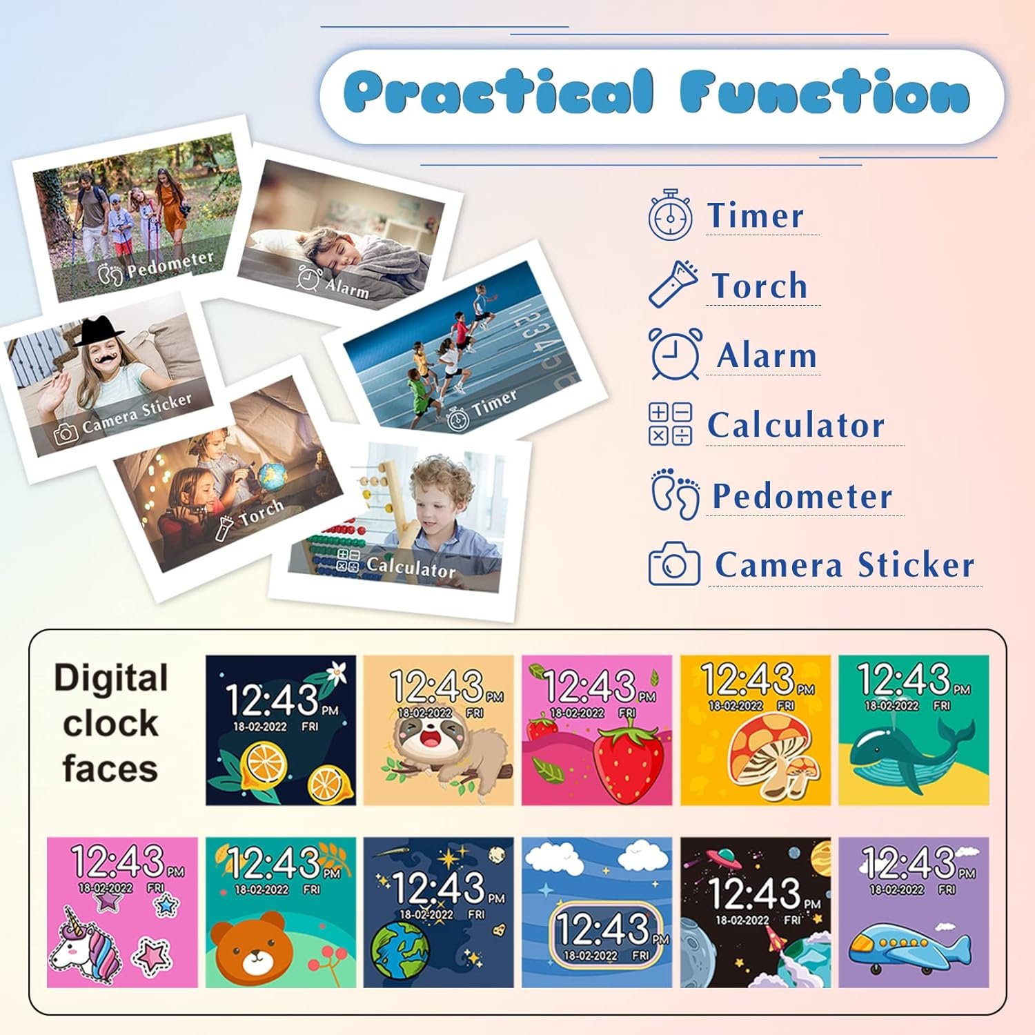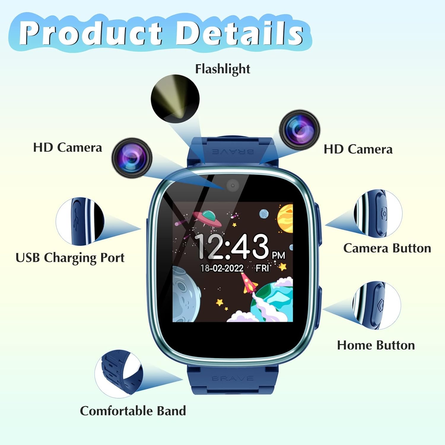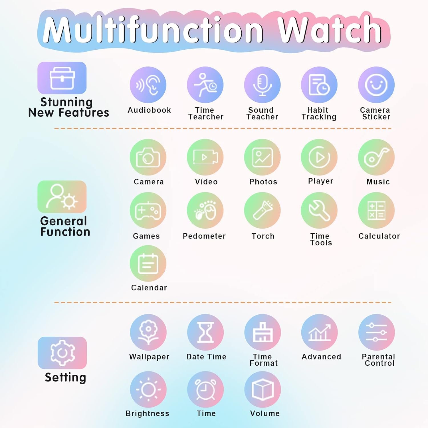Newest Features Never Seen Before: This kids smart watch introduced Audiobook, Time Teacher, Sound Teacher, Habit, Camera Sticker, Parental Control, and still include cameras, games, alarm clocks, music,etc. that traditional watches have.