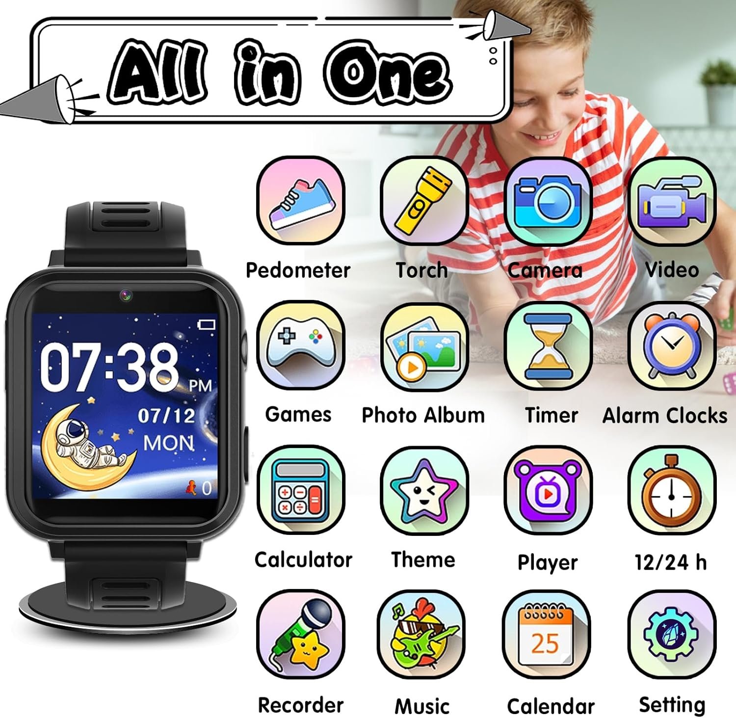 24 Puzzle Games: Our kids smartwatch is equipped with 24 engaging puzzle games, offering delightful interactive experiences for kids. It’s the perfect birthday gifts or holiday surprise for boys and girls aged 3-12, bringing moments of joy to their lives