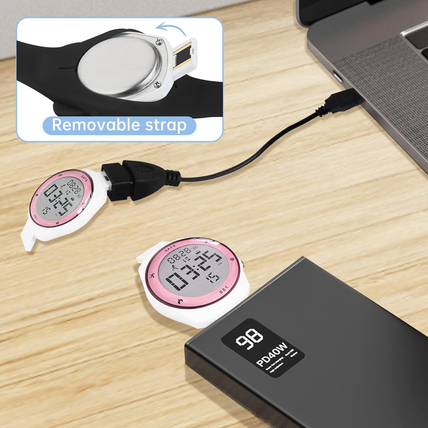 The watch face is equipped with a USB interface. You can use any USB adapter (such as smartphone adapter, computer) to charge the watch, and the battery life is more than 10-20 days. (We supply a USB charging cable)
