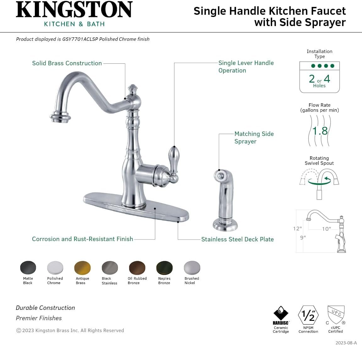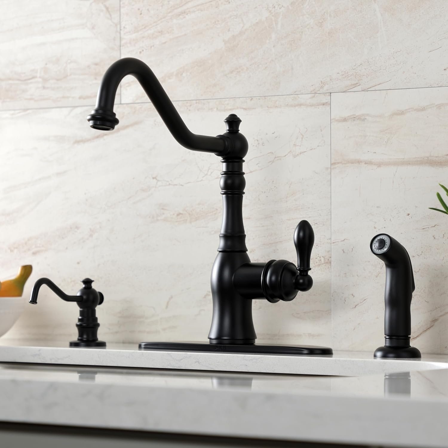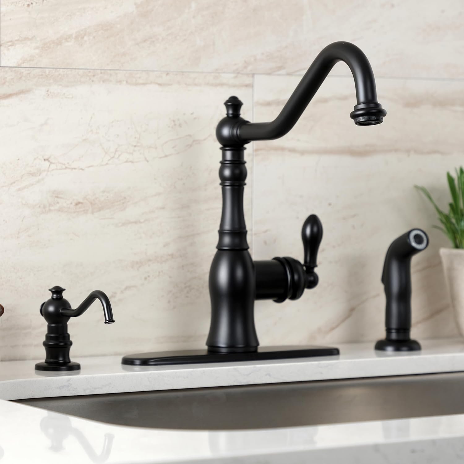 This faucet is perfect for those seeking inspiration from the exquisite artistry and architecture of the traditional Victorian era. Enjoy the strong and durable brass material and matte black finish that will last for years to come. Easily adaptable to any kitchen, the American Classic single-handle kitchen faucet with sprayer and deck plate is prized for its easy-to-use single handle. This makes it the perfect fixture for multitasking as you can adjust temperature and volume in one swipe. The included matching finish side-sprayer also adds convenience in cleaning hard-to-reach areas.
