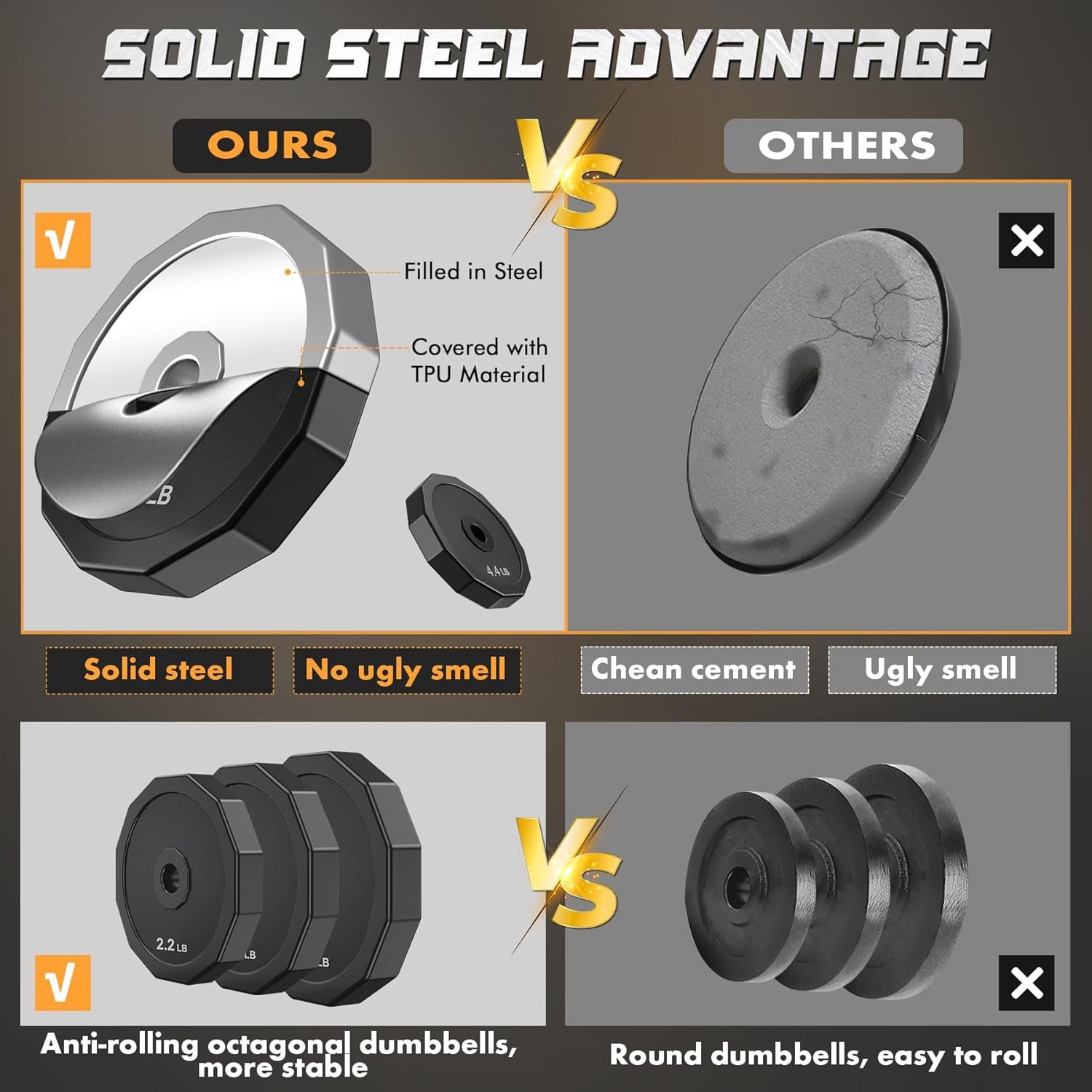 Upgraded Solid Steel Material with Durable: Compared with the other cement material dumbbells on the market,our adjustable dumbbell set are made of solid steel,thinner,more durable, stable and true weight. Dumbbell weights plate coated is made of TPU material, high security, unbreakable,soundproof and protects the floor. Polygonal design prevents scrolling and makes for easy storage and use.Chrome connecting rod is knurled to ensure a firm grip,while the rubber-coated handle prevents slipping.