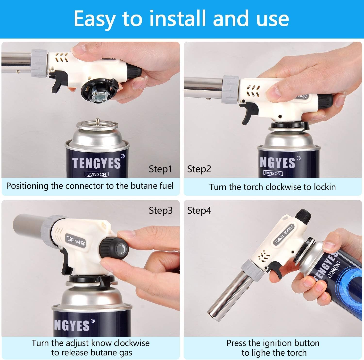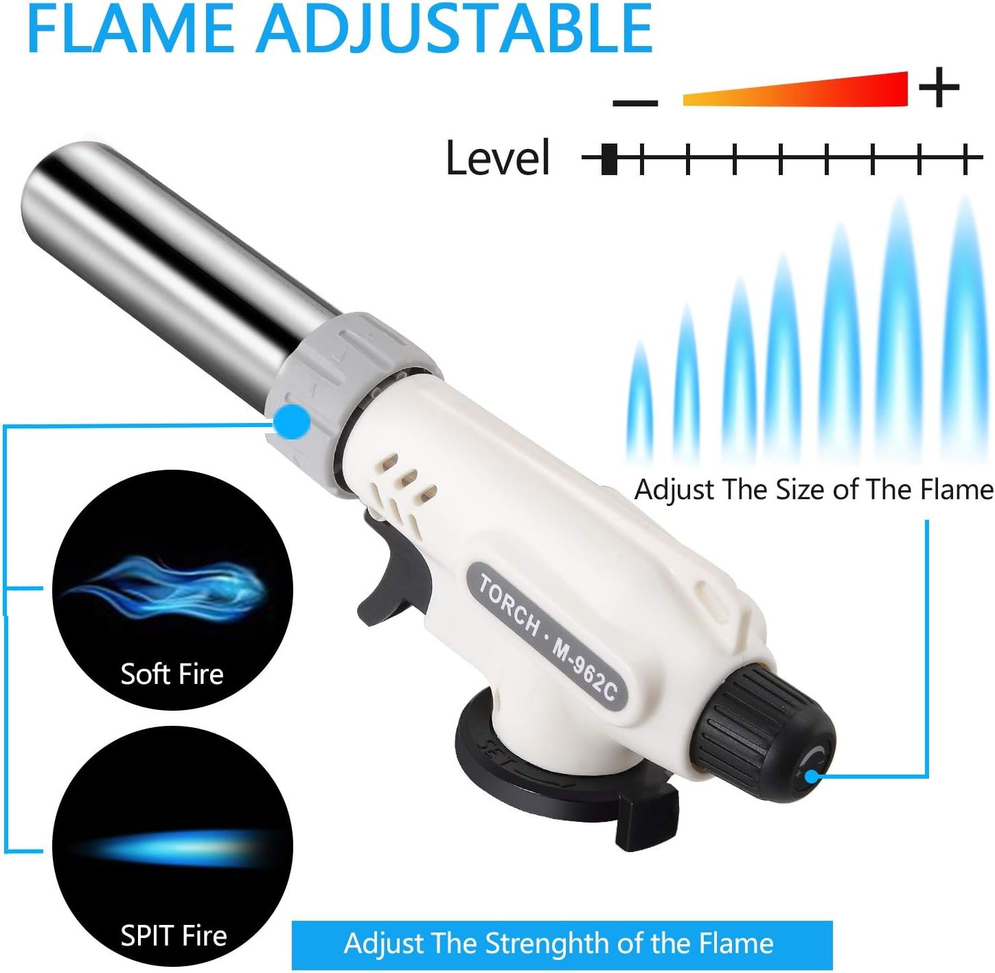 Light Up with Piezo Ignition Technology – Just press to light fire, easy to operate with the gas flow regulator and air flow control valve cooking torch, can be flame intensity controlled, close the valve switch, the flame goes off!