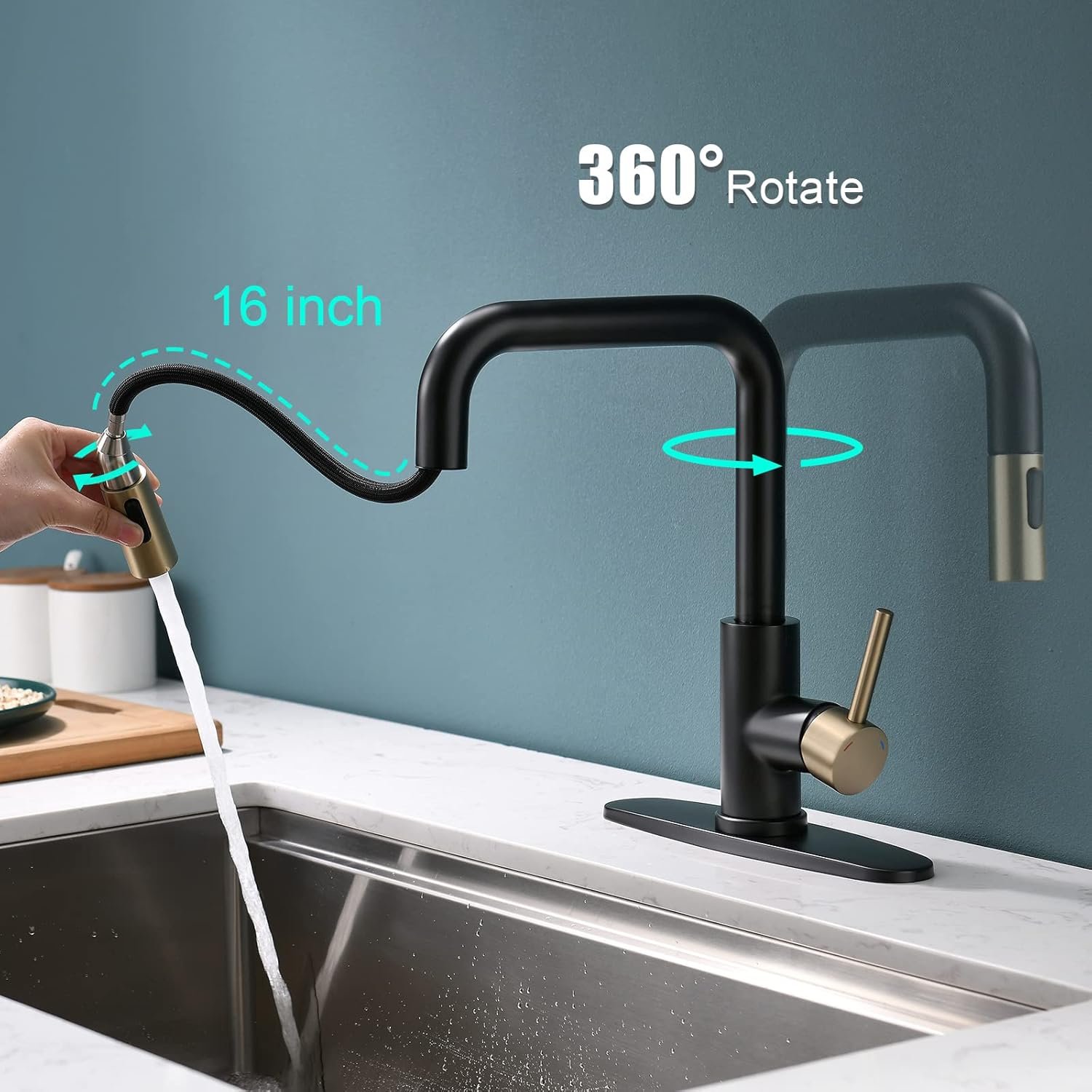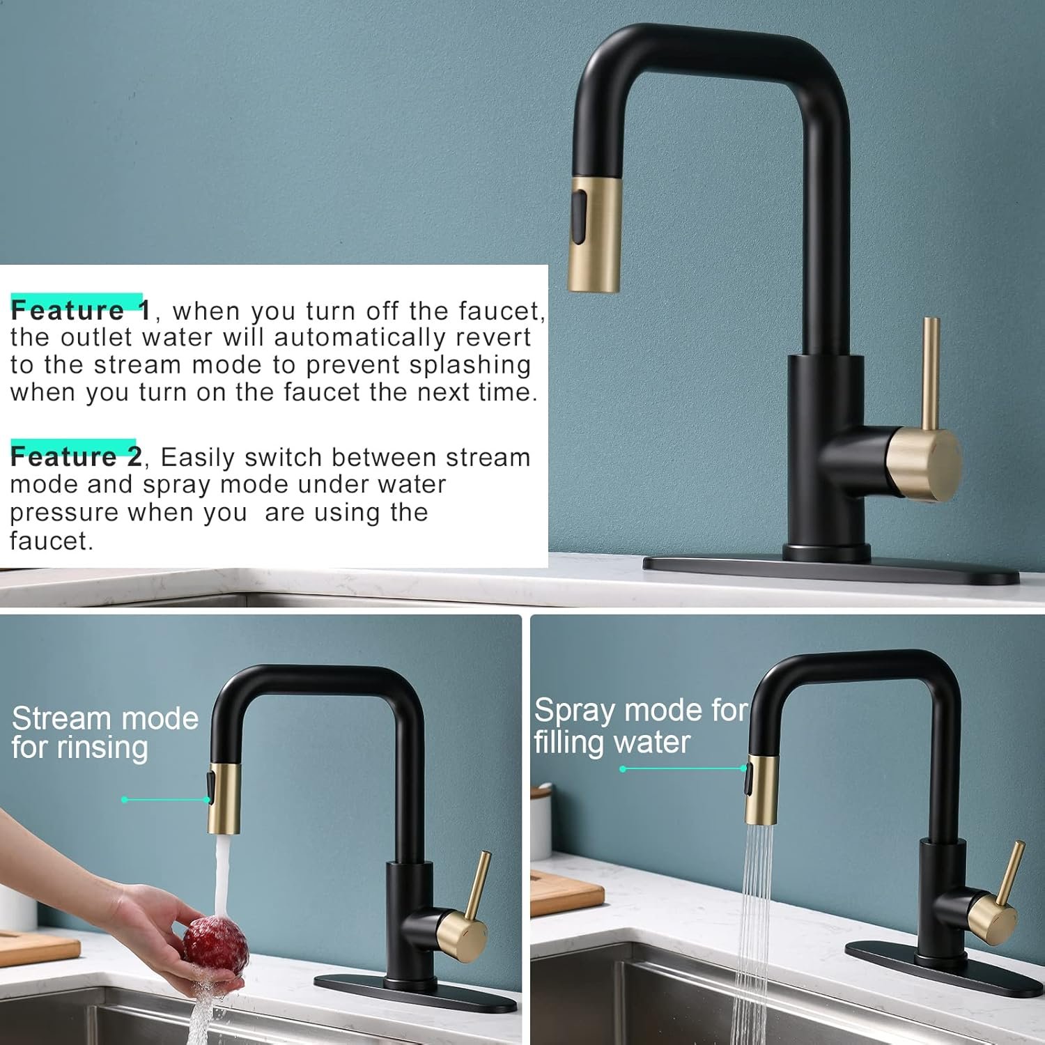 [Easy Operate in Daily Use]-360 degree swivel sprayer and spout with 2 function head(stream and Spray), stream for filling water, spray for rinsing. Firmly matte black treatment, effective anti-corrosion and anti-rust.