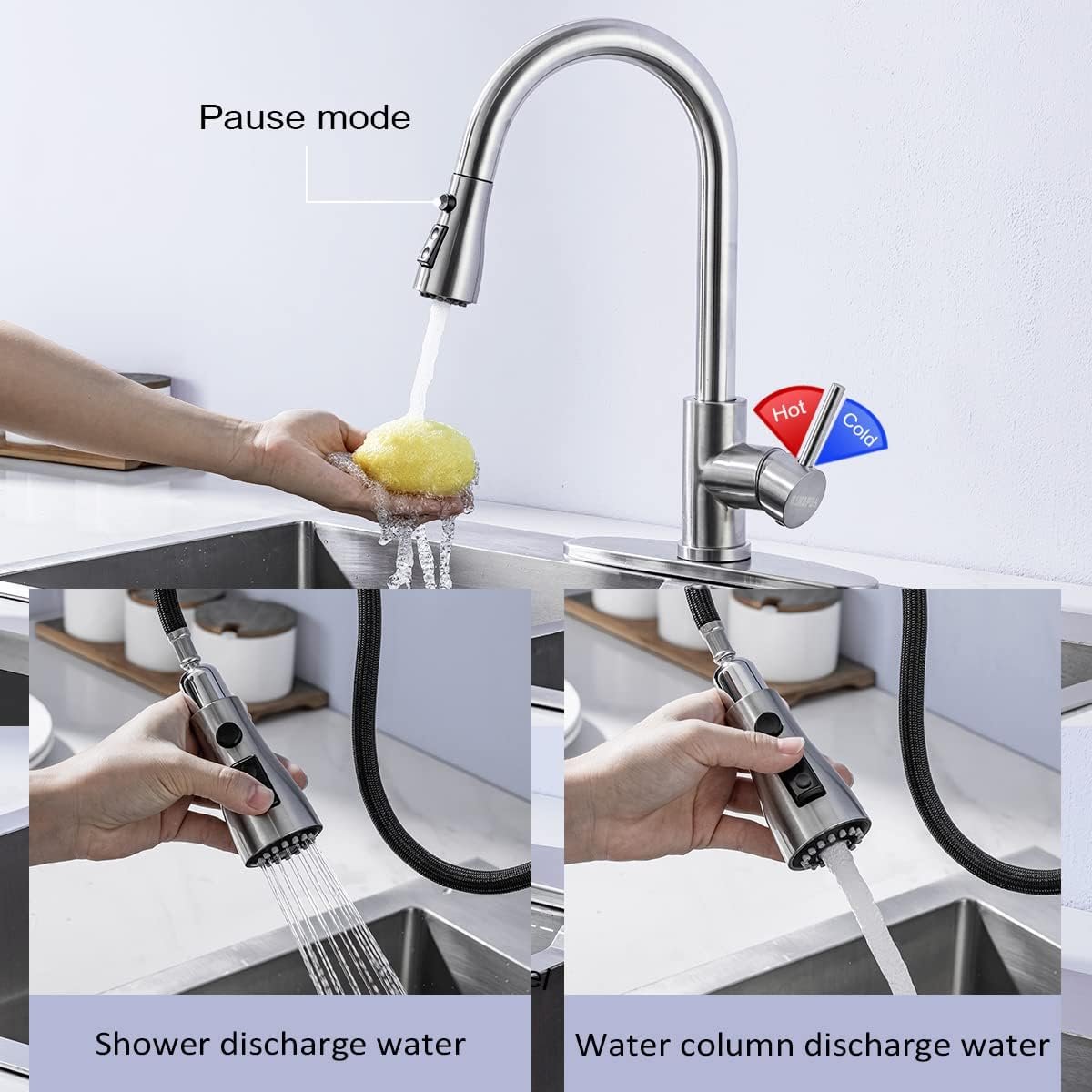 ✔【Multi-function】HSHAPAY kitchen faucet has 3-spray modes.spray mode for rinsing dishes with quick cleaning; pause mode for water-saving and convenient. You can choose the appropriate mode according to your washing