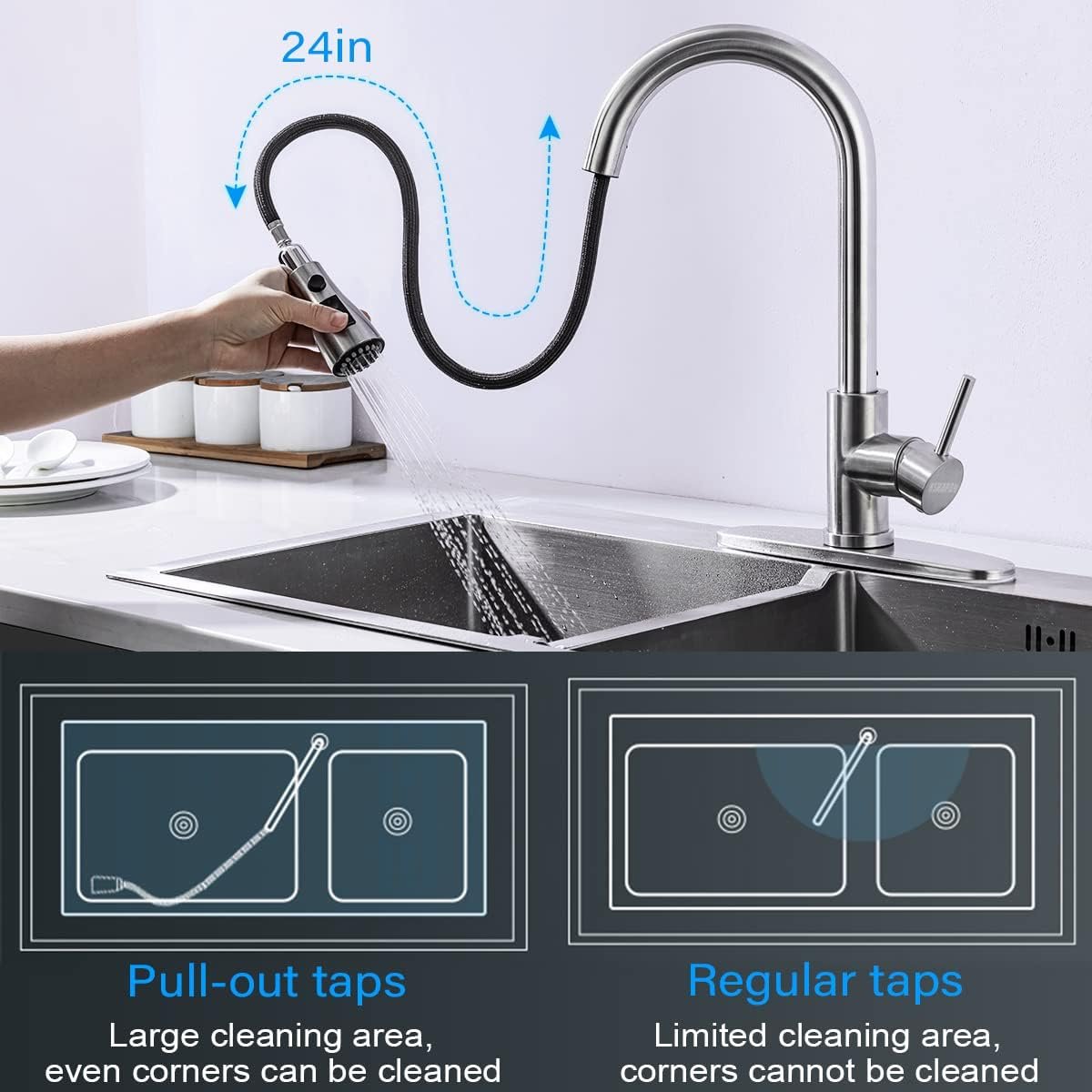 ✔【Ease Of Use】This faucet features single handled control of both water flow and temperature. It is high arched with 360 degrees swiveling. The water faucet hose extends to a full 24” available for outside sink range operation. Very convenient.
