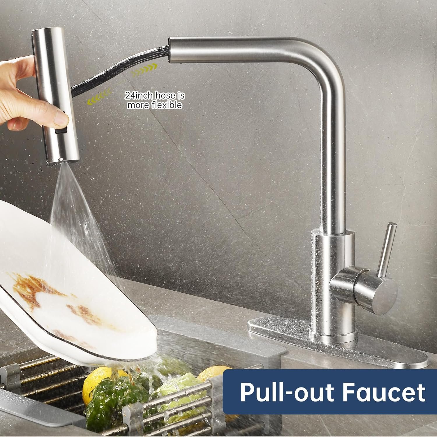 3-in-1 function: 90° rotation effortlessly switches between waterfall and stream, sweeping mode. Waterfall mode is ideal for cleaning large areas. Stream mode is ideal for filling water quickly without splashing. Sweep mode is good for cleaning dishes efficiently. With a 24-inch pull-out hose and 360° swivel design, whether you’re washing dishes, filling containers or cleaning large areas, this faucet has you covered.