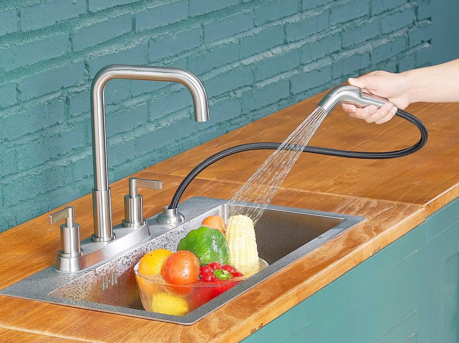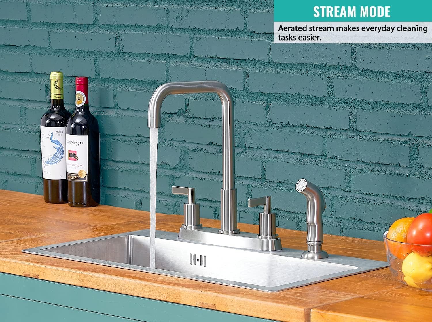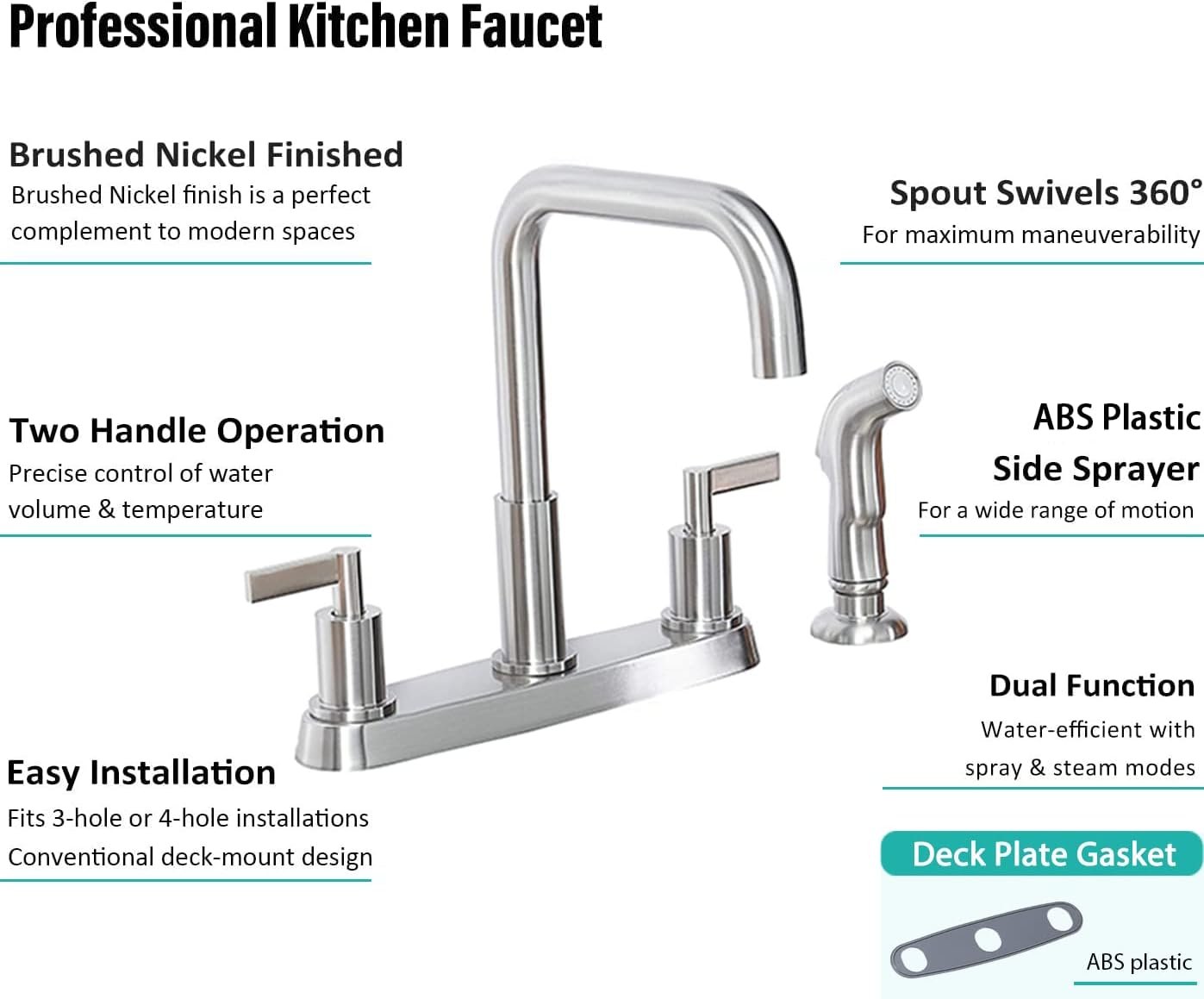 Easy Cleaning and Installation: Premium multiple layer brushed nickel coated kitchen faucet resists rust, corrosion, and tarnish. Designed to fit 3-hole, 8-inch configurations.